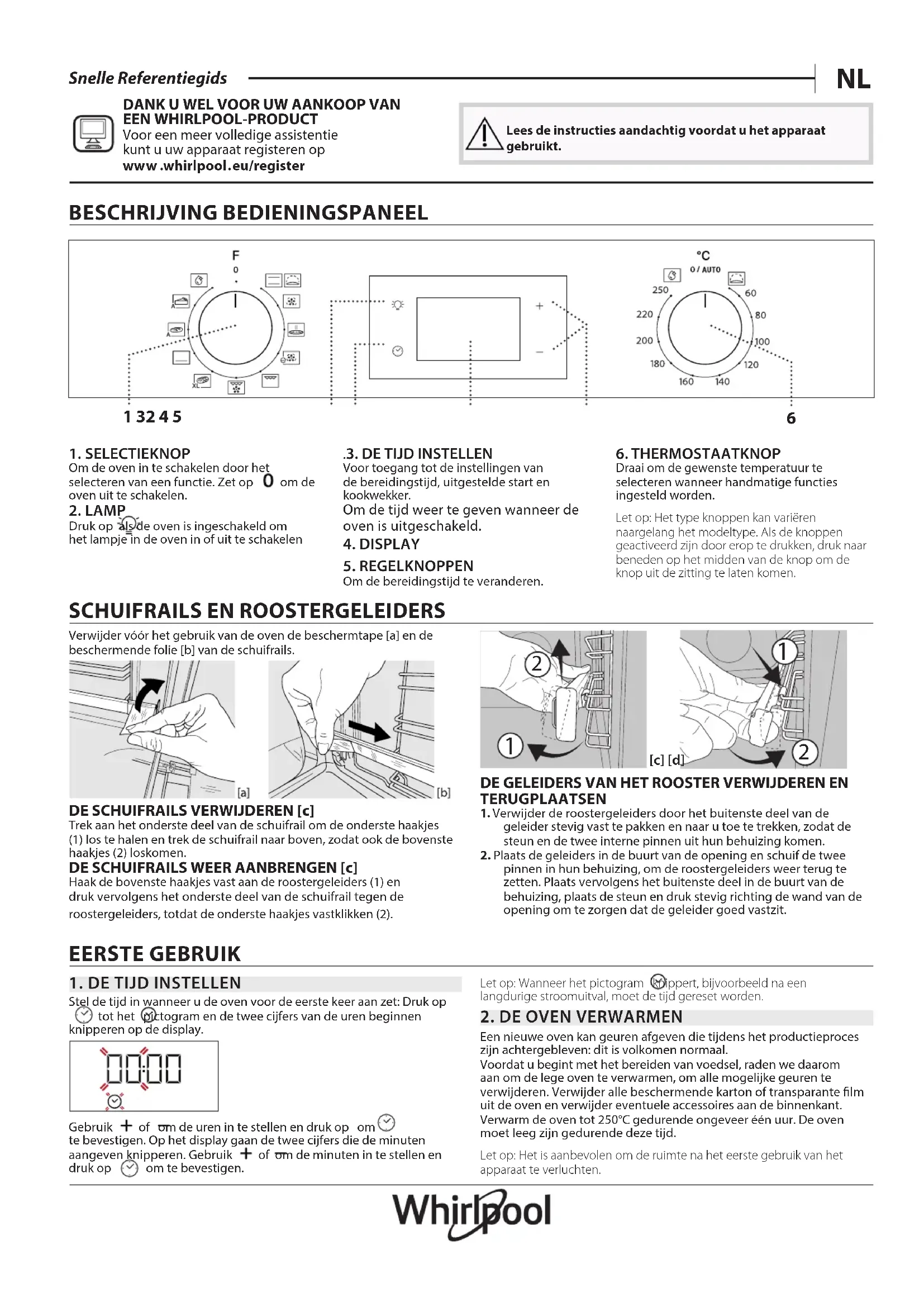 [c] [d]DE GELEIDERS VAN HET ROOSTER VERWIJDEREN EN TERUGPLAATSEN1. Verwijder de roostergeleiders door het buitenste deel van de geleider stevig vast te pakken en naar u toe te trekken, zodat de steun en de twee interne pinnen uit hun behuizing komen.2. Plaats de geleiders in de buurt van de opening en schuif de twee pinnen in hun behuizing, om de roostergeleiders weer terug te zetten. Plaats vervolgens het buitenste deel in de buurt van de behuizing, plaats de steun en druk stevig richting de wand van de opening om te zorgen dat de geleider goed vastzit.EERSTE GEBRUIK1. DE TIJD INSTELLENStel de tijd in wanneer u de oven voor de eerste keer aan zet: Druk optot het pictogram en de twee cijfers van de uren beginnen knipperen op de display.Gebruik of om de uren in te stellen en druk op om te bevestigen. Op het display gaan de twee cijfers die de minuten aangeven knipperen. Gebruik of om de minuten in te stellen en druk op om te bevestigen.Let op: Wanneer het pictogram knippert, bijvoorbeeld na een langdurige stroomuitval, moet de tijd gereset worden.2. DE OVEN VERWARMENEen nieuwe oven kan geuren afgeven die tijdens het productieproces zijn achtergebleven: dit is volkomen normaal.Voordat u begint met het bereiden van voedsel, raden we daarom aan om de lege oven te verwarmen, om alle mogelijke geuren te verwijderen. Verwijder alle beschermende karton of transparante lm uit de oven en verwijder eventuele accessoires aan de binnenkant. Verwarm de oven tot 250°C gedurende ongeveer één uur. De oven moet leeg zijn gedurende deze tijd.Let op: Het is aanbevolen om de ruimte na het eerste gebruik van het apparaat te verluchten.BESCHRIJVING BEDIENINGSPANEEL1 32 4 5 1. SELECTIEKNOPOm de oven in te schakelen door het selecteren van een functie. Zet op om de oven uit te schakelen.2. LAMPDruk op als de oven is ingeschakeld om het lampje in de oven in of uit te schakelen 3. DE TIJD INSTELLENVoor toegang tot de instellingen van de bereidingstijd, uitgestelde start en kookwekker.Om de tijd weer te geven wanneer de oven is uitgeschakeld.4. DISPLAY5. REGELKNOPPENOm de bereidingstijd te veranderen.6. THERMOSTAATKNOPDraai om de gewenste temperatuur te selecteren wanneer handmatige functies ingesteld worden Let op: Het type knoppen kan variëren naargelang het modeltype. Als de knoppen geactiveerd zijn door erop te drukken, druk naar beneden op het midden van de knop om de knop uit de zitting te laten komen.DANK U WEL VOOR UW AANKOOP VAN EEN WHIRLPOOL-PRODUCTVoor een meer volledige assistentie kunt u uw apparaat registeren op ww w . whirlpool . eu/registerLees de instructies aandachtig voordat u het apparaat gebruikt.FUNCTIES & DAGELIJKS GEBRUIK STATISCH Voor het bereiden van gerechten op één steunhoogte. RIJZEN Om zoet of hartig deeg goed te laten rijzen. Om de functie in te schakelen draait u de thermostaatknop op het pictogram. HETE LUCHT Om verschillende soorten voedsel te bereiden met dezelfde bereidingstemperatuur op verschillende niveaus (maximaal drie) tegelijk. Met deze functie worden er geen geuren van het ene naar het andere gerecht overgebracht. PIZZA Voor het bakken van verschillende soorten en formaten pizza en brood. Verwissel halverwege de bereiding de positie van de ovenplaten. ECO HETELUCHT Gevulde braadstukken en stukken vlees op één steunhoogte bereiden. Door zachte, intermitterende luchtcirculatie wordt voorkomen dat het voedsel teveel uitdroogt. Wanneer de ECO-functie in gebruik is zal de verlichting tijdens de bereiding uitgeschakeld blijven, maar deze kan weer tijdelijk worden ingeschakeld door te drukken op