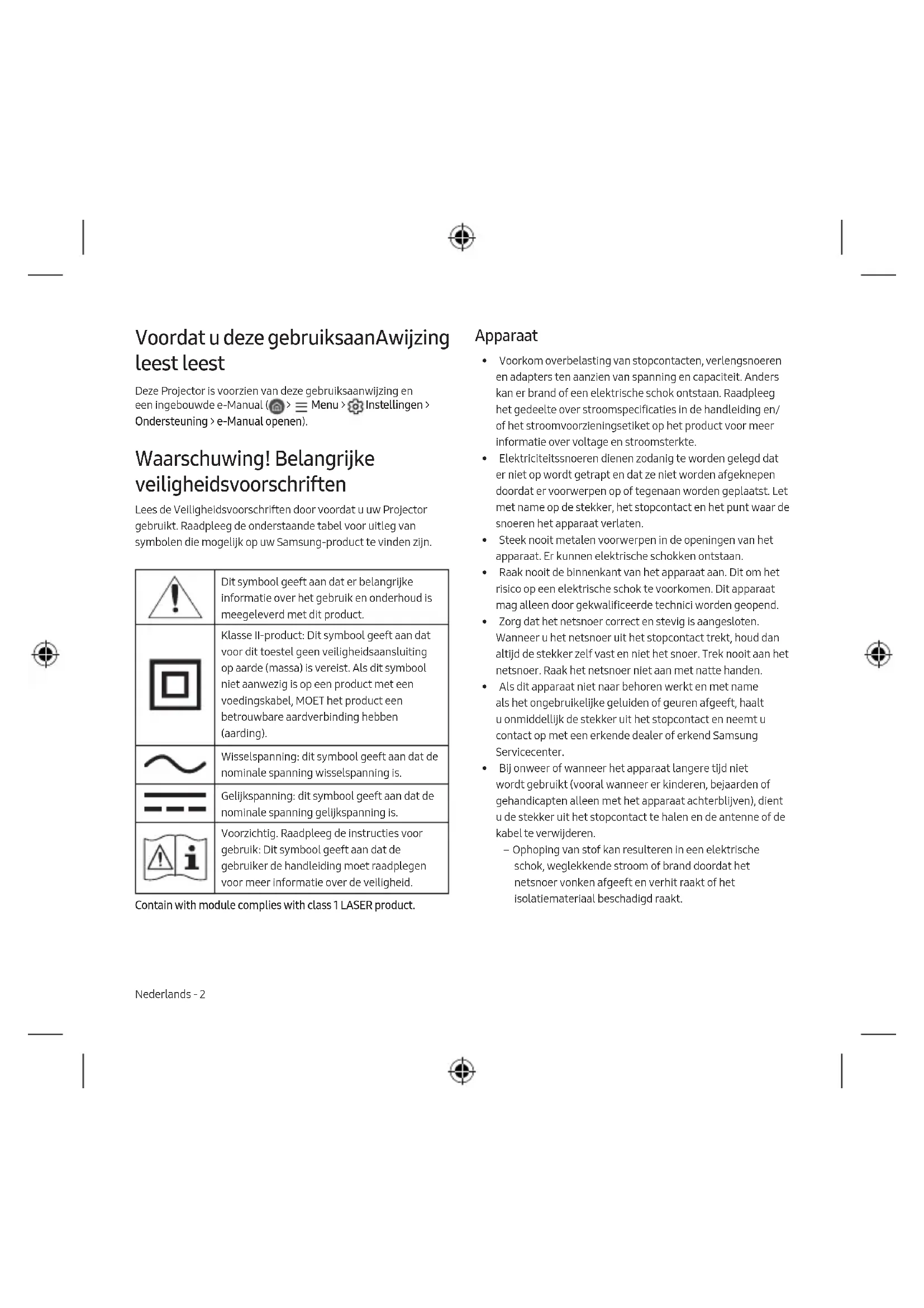 - Queste licenze potrebbero non essere supportate in base al modello posseduto o all'area geografica di appartenenza. The terms HDMI and HDMI High-Definition Multimedia Interface, and the HDMI Logo are trademarks or registered trademarks of HDMI Licensing Administrator, Inc. in the United States and other countries.Questa pagina è stata lasciata intenzionalmente vuota.Nederlands - 2 Voordat u deze gebruiksaanAwijzing leest leest Deze Projector is voorzien van deze gebruiksaanwijzing en een ingebouwde e-Manual ( > Menu > Instellingen > Ondersteuning > e-Manual openen). Waarschuwing! Belangrijke veiligheidsvoorschriften Lees de Veiligheidsvoorschriften door voordat u uw Projector gebruikt. Raadpleeg de onderstaande tabel voor uitleg van symbolen die mogelijk op uw Samsung-product te vinden zijn. Dit symbool geeft aan dat er belangrijke informatie over het gebruik en onderhoud is meegeleverd met dit product. Klasse II-product: Dit symbool geeft aan dat voor dit toestel geen veiligheidsaansluiting op aarde (massa) is vereist. Als dit symbool niet aanwezig is op een product met een voedingskabel, MOET het product een betrouwbare aardverbinding hebben (aarding). Wisselspanning: dit symbool geeft aan dat de nominale spanning wisselspanning is. Gelijkspanning: dit symbool geeft aan dat de nominale spanning gelijkspanning is. Voorzichtig. Raadpleeg de instructies voor gebruik: Dit symbool geeft aan dat de gebruiker de handleiding moet raadplegen voor meer informatie over de veiligheid. Contain with module complies with class 1 LASER product. Apparaat