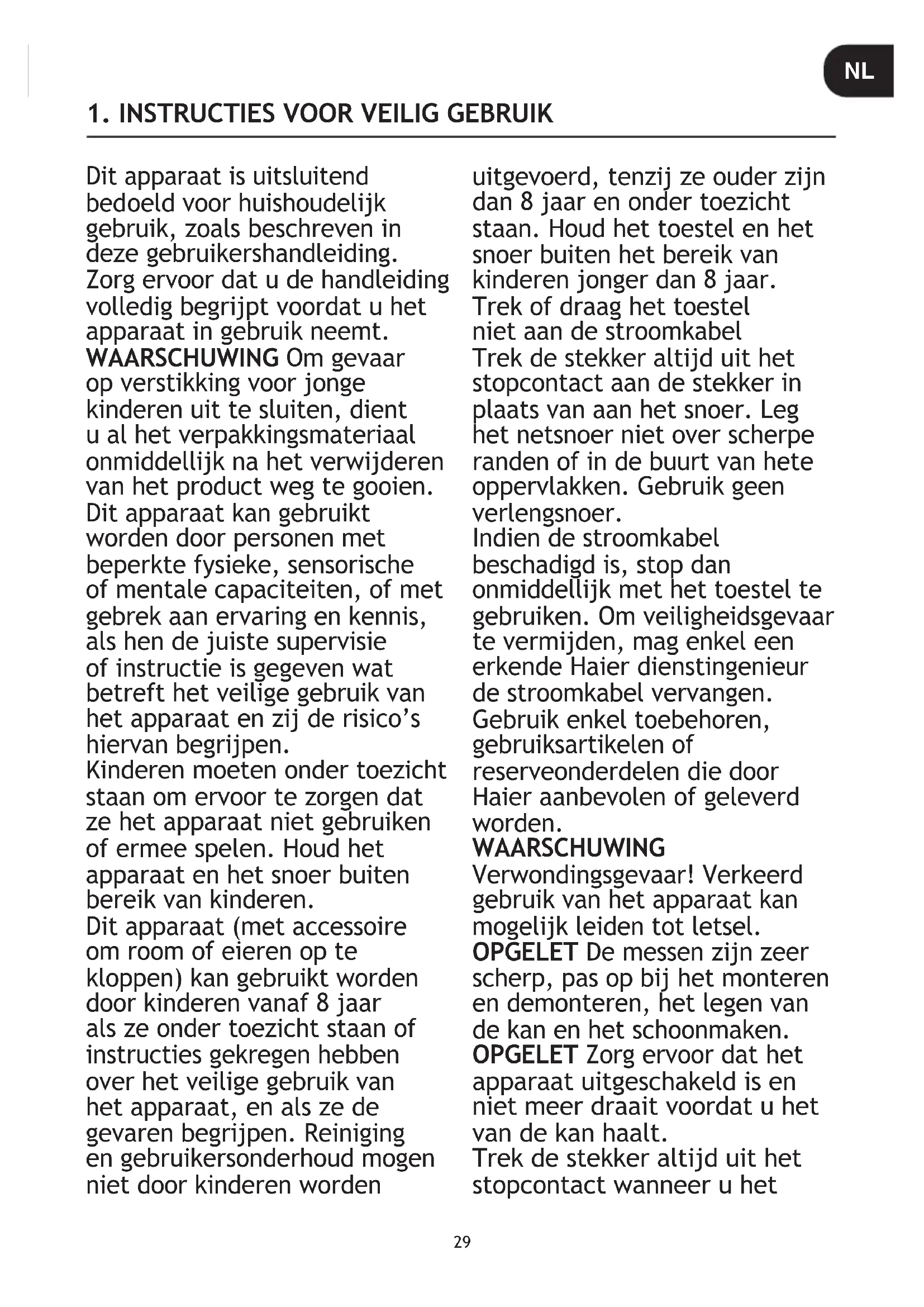 funzionamento. Lasciare che l’unità si rareddi prima di riprendere l’utilizzo.29 Dit apparaat is uitsluitend bed oeld voor huishoudelijk gebruik, zoals beschreven in deze gebruikershandleiding. Zorg ervoor dat u de handleiding volledig begrijpt voordat u het apparaat in gebruik neemt. WAARSCHUWING Om gevaar op verstikking voor jonge kinderen uit te sluiten, dient u al het verpakkingsmateriaal onmiddellijk na het verwijderen van het product weg te gooien. Dit apparaat kan gebruikt worden door personen met beperkte fysieke, sensorische of mentale capaciteiten, of met gebrek aan ervaring en kennis, als hen de juiste supervisie of instructie is gegeven wat betreft het veilige gebruik van het apparaat en zij de risico’s hiervan begrijpen. Kinderen moeten onder toezicht staan om ervoor te zorgen dat ze het apparaat niet gebruiken of ermee spelen. Houd het apparaat en het snoer buiten bereik van kinderen. Dit apparaat (met accessoire om room of eieren op te kloppen) kan gebruikt worden door kinderen vanaf 8 jaar als ze onder toezicht staan of instructies gekregen hebben over het veilige gebruik van het apparaat, en als ze de gevaren begrijpen. Reiniging en gebruikersonderhoud mogen niet door kinderen worden uitgevoerd, tenzij ze ouder zijn dan 8 jaar en onder toezicht staan. Houd het toestel en het snoer buiten het bereik van kinderen jonger dan 8 jaar. Trek of draag het toestel niet aan de stroomkabel Trek de stekker altijd uit het stopcontact aan de stekker in plaats van aan het snoer. Leg het netsnoer niet over scherpe randen of in de buurt van hete oppervlakken. Gebruik geen verlengsnoer. Indien de stroomkabel beschadigd is, stop dan onmiddellijk met het toestel te gebruiken. Om veiligheidsgevaar te vermijden, mag enkel een erkende Haier dienstingenieur de stroomkabel vervangen. Gebruik enkel toebehoren, gebruiksartikelen of reserveonderdelen die door Haier aanbevolen of geleverd worden. WAARSCHUWING Verwondingsgevaar! Verkeerd gebruik van het apparaat kan mogelijk leiden tot letsel. OPGELET De messen zijn zeer scherp, pas op bij het monteren en demonteren, het legen van de kan en het schoonmaken. OPGELET Zorg ervoor dat het apparaat uitgeschakeld is en niet meer draait voordat u het van de kan haalt. Trek de stekker altijd uit het stopcontact wanneer u het