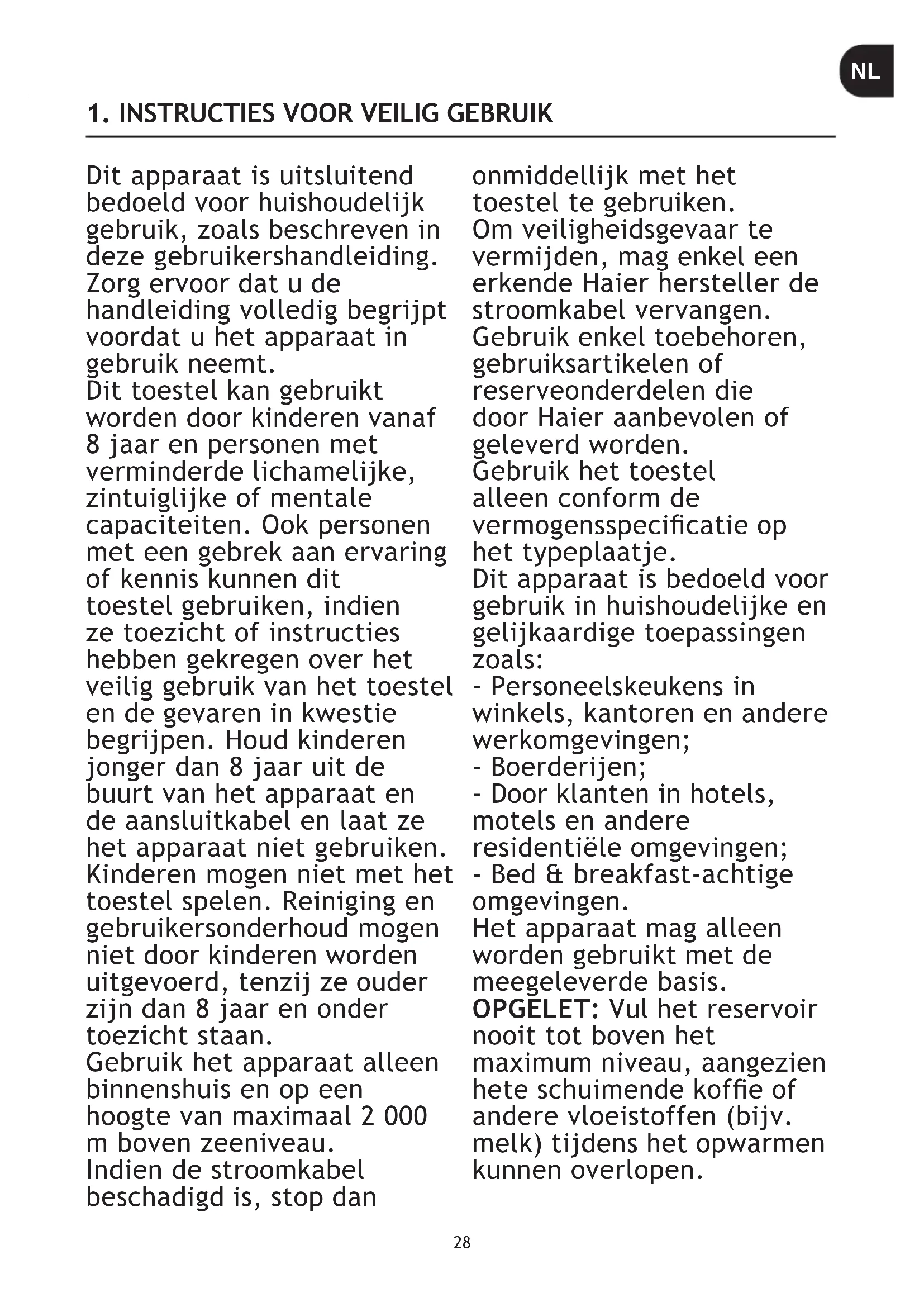 - I contenuti possono variare secondo il modello. IT28 Dit apparaat is uitsluitend bedoeld voor huishoudelijk gebruik, zoals beschreven in deze gebruikershandleiding. Zorg ervoor dat u de handleiding volledig begrijpt voordat u het apparaat in gebruik neemt. Dit toestel kan gebruikt worden door kinderen vanaf 8 jaar en personen met verminderde lichamelijke, zintuiglijke of mentale capaciteiten. Ook personen met een gebrek aan ervaring of kennis kunnen dit toestel gebruiken, indien ze toezicht of instructies hebben gekregen over het veilig gebruik van het toestel en de gevaren in kwestie begrijpen. Houd kinderen jonger dan 8 jaar uit de buurt van het apparaat en de aansluitkabel en laat ze het apparaat niet gebruiken. Kinderen mogen niet met het toestel spelen. Reiniging en gebruikersonderhoud mogen niet door kinderen worden uitgevoerd, tenzij ze ouder zijn dan 8 jaar en onder toezicht staan. Gebruik het apparaat alleen binnenshuis en op een hoogte van maximaal 2 000 m boven zeeniveau. Indien de stroomkabel beschadigd is, stop dan onmiddellijk met het toestel te gebruiken. Om veiligheidsgevaar te vermijden, mag enkel een erkende Haier hersteller de stroomkabel vervangen. Gebruik enkel toebehoren, gebruiksartikelen of reserveonderdelen die door Haier aanbevolen of geleverd worden. Gebruik het toestel alleen conform de vermogensspecicatie op het typeplaatje. Dit apparaat is bedoeld voor gebruik in huishoudelijke en gelijkaardige toepassingen zoals: - Personeelskeukens in winkels, kantoren en andere werkomgevingen; - Boerderijen; - Door klanten in hotels, motels en andere residentiële omgevingen; - Bed & breakfast-achtige omgevingen. Het apparaat mag alleen worden gebruikt met de meegeleverde basis. OPGELET: Vul het reservoir nooit tot boven het maximum niveau, aangezien hete schuimende kofe of andere vloeistoffen (bijv. melk) tijdens het opwarmen kunnen overlopen.