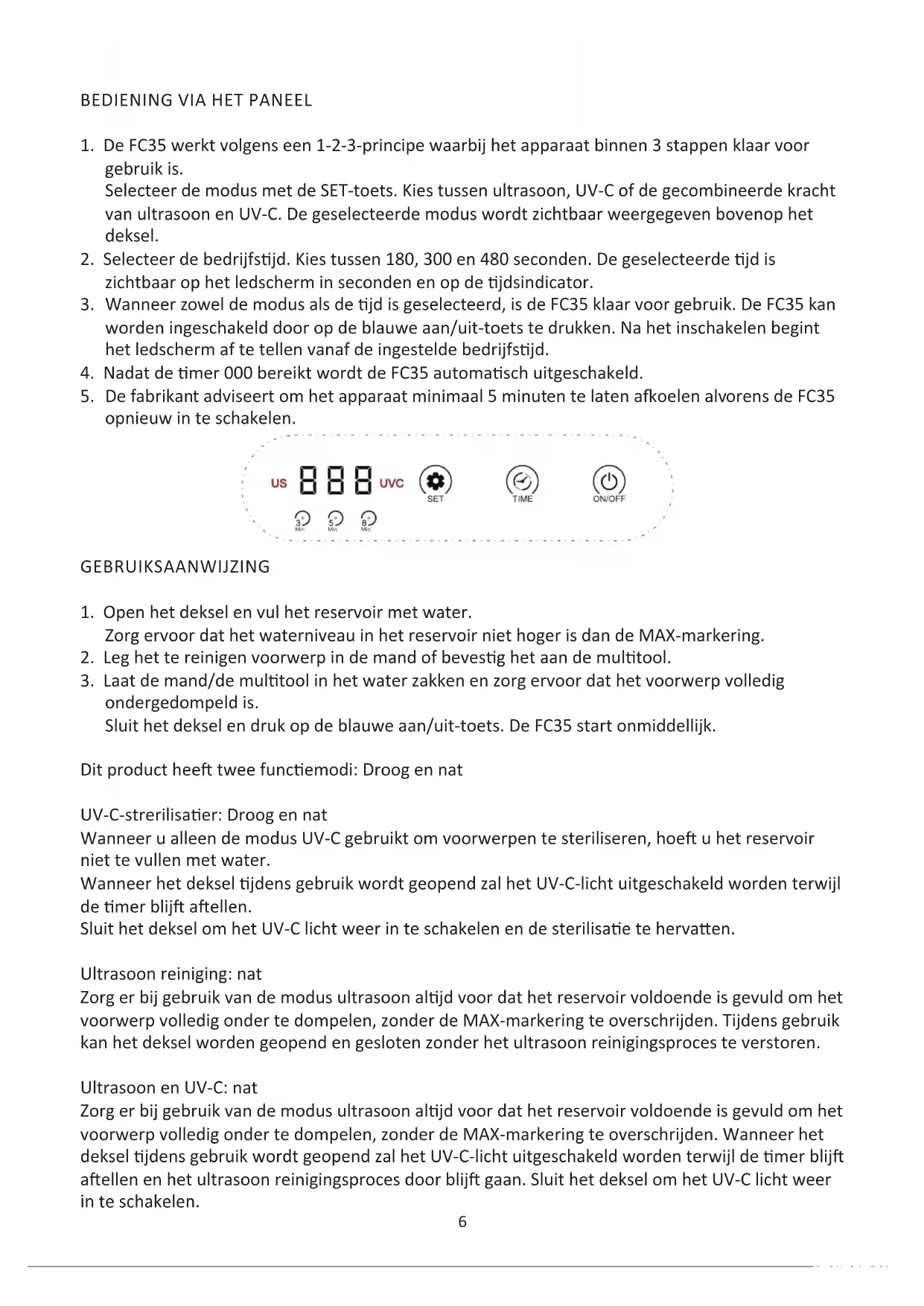 ondergedompeld is. Sluit het deksel en druk op de blauwe aan/uit-toets. De FC35 start onmiddellijk. Dit product hee twee funcemodi: Droog en nat UV-C-strerilisaer: Droog en nat Wanneer u alleen de modus UV-C gebruikt om voorwerpen te steriliseren, hoe u het reservoir niet te vullen met water. Wanneer het deksel jdens gebruik wordt geopend zal het UV-C-licht uitgeschakeld worden terwijl de mer blij aellen. Sluit het deksel om het UV-C licht weer in te schakelen en de sterilisae te hervaen. Ultrasoon reiniging: nat Zorg er bij gebruik van de modus ultrasoon aljd voor dat het reservoir voldoende is gevuld om het voorwerp volledig onder te dompelen, zonder de MAX-markering te overschrijden. Tijdens gebruik kan het deksel worden geopend en gesloten zonder het ultrasoon reinigingsproces te verstoren. Ultrasoon en UV-C: nat Zorg er bij gebruik van de modus ultrasoon aljd voor dat het reservoir voldoende is gevuld om het voorwerp volledig onder te dompelen, zonder de MAX-markering te overschrijden. Wanneer het deksel jdens gebruik wordt geopend zal het UV-C-licht uitgeschakeld worden terwijl de mer blij aellen en het ultrasoon reinigingsproces door blij gaan. Sluit het deksel om het UV-C licht weer in te schakelen.7