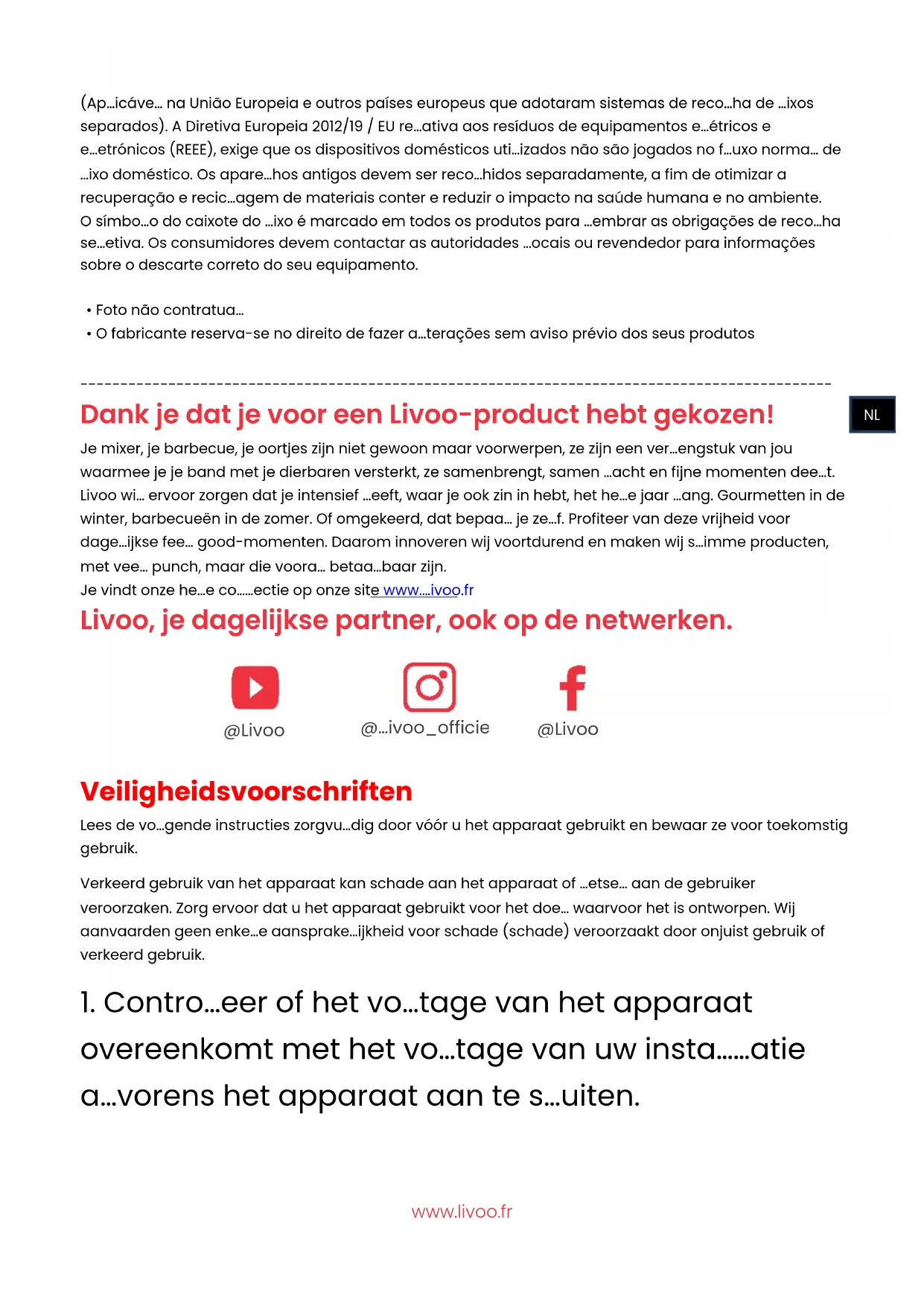 Dank je dat je voor een Livoo-product hebt gekozen! Je mixer, je barbecue, je oortjes zijn niet gewoon maar voorwerpen, ze zijn een verlengstuk van jou waarmee je je band met je dierbaren versterkt, ze samenbrengt, samen lacht en fijne momenten deelt. Livoo wil ervoor zorgen dat je intensief leeft, waar je ook zin in hebt, het hele jaar lang. Gourmetten in de winter, barbecueën in de zomer. Of omgekeerd, dat bepaal je zelf. Profiteer van deze vrijheid voor dagelijkse feel good-momenten. Daarom innoveren wij voortdurend en maken wij slimme producten, met veel punch, maar die vooral betaalbaar zijn. Je vindt onze hele collectie op onze site www.livoo.fr Livoo, je dagelijkse partner, ook op de netwerken.