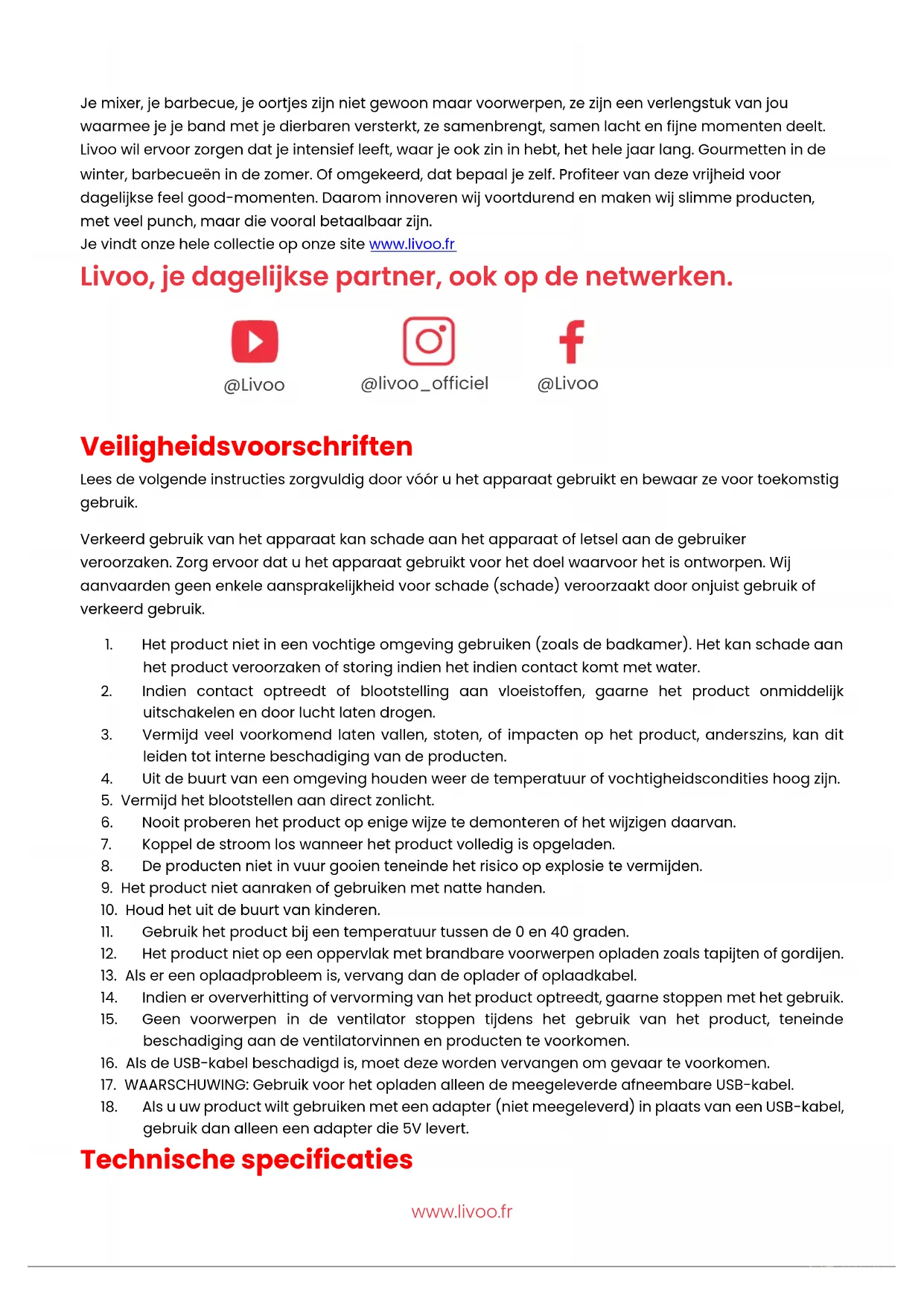 gebruik dan alleen een adapter die 5V levert. Technische specificaties @livoo_officiel @Livoo @Livoowww.livoo.fr . Doorsnede: 11 cm . 3 snelheden . 3 verstelbare flexibele voeten . Aan/uitknop met indicatielampje . USBC-kabel meegeleverd . Vermogen 3W .Oplaadbare batterij Lithium 3.7V, 1800 mAh . Tot 9 uur batterijduur . Oplaadtijd: 4 uur . Ingang: DC 5V-1A