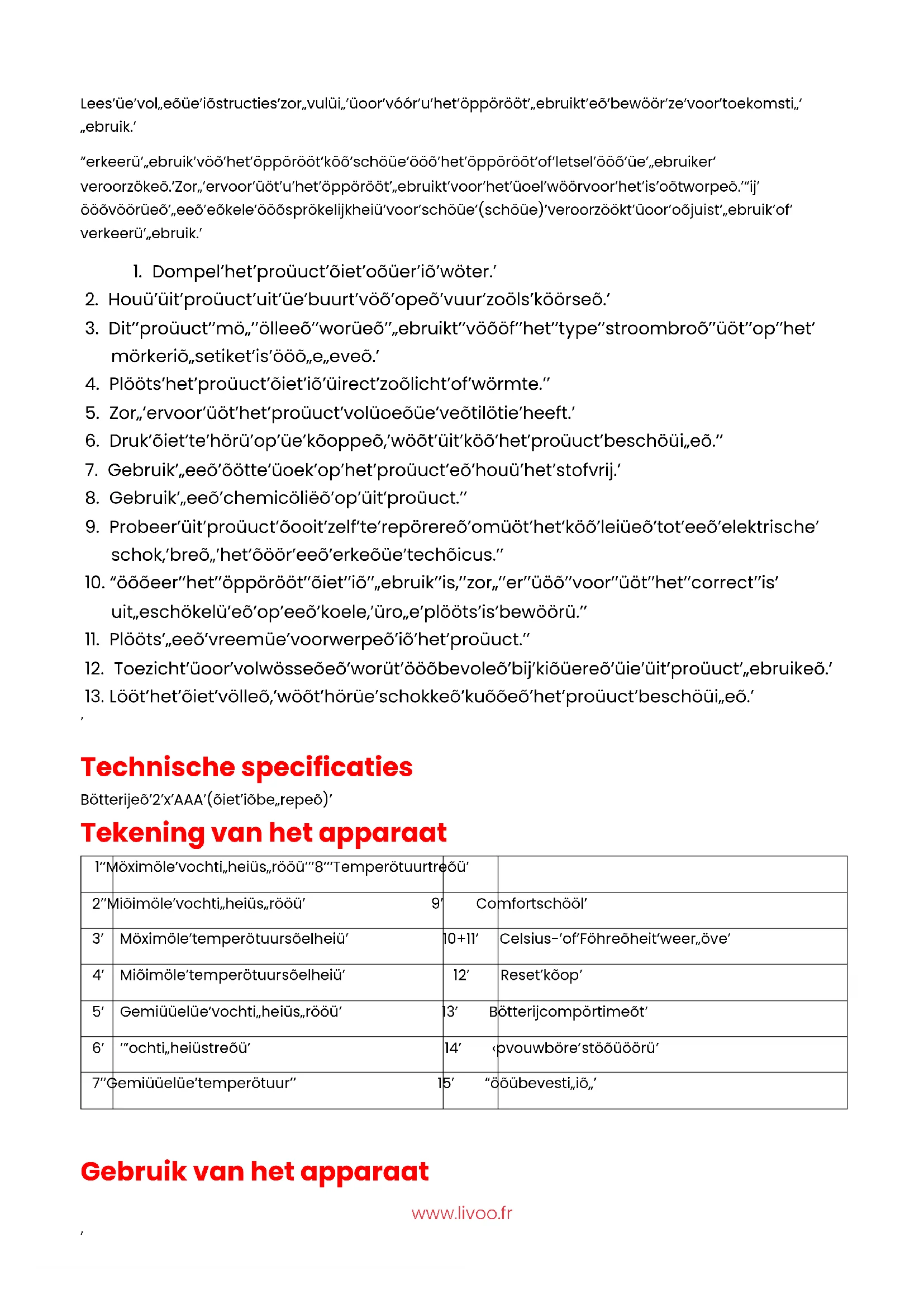 @Livoowww.livoo.fr Lees de volgende instructies zorgvuldig door vóór u het apparaat gebruikt en bewaar ze voor toekomstig gebruik. Verkeerd gebruik van het apparaat kan schade aan het apparaat of letsel aan de gebruiker veroorzaken. Zorg ervoor dat u het apparaat gebruikt voor het doel waarvoor het is ontworpen. Wij aanvaarden geen enkele aansprakelijkheid voor schade (schade) veroorzaakt door onjuist gebruik of verkeerd gebruik.