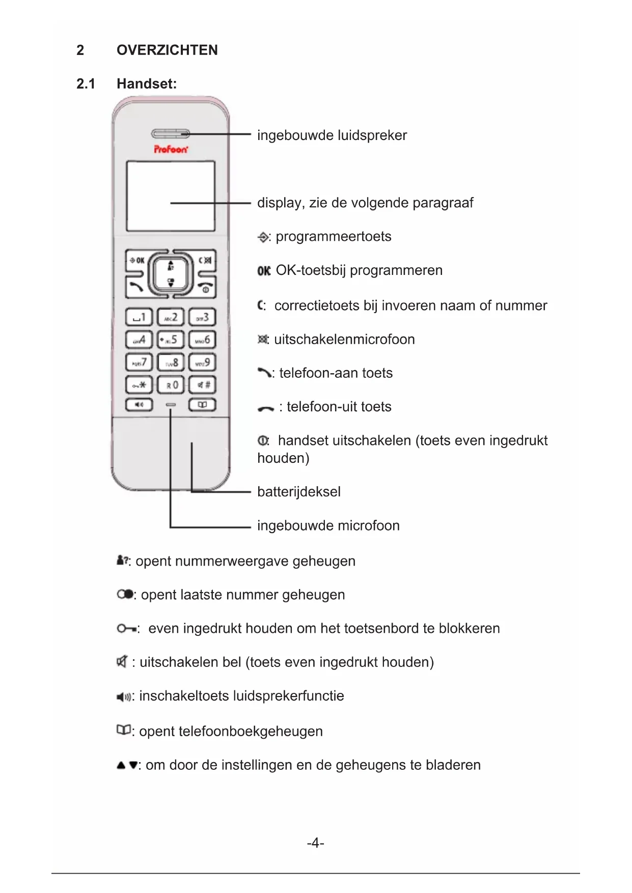 ingebouwde luidspreker display, zie de volgende paragraaf : programmeertoets : OK-toets bij programmeren : correctietoets bij invoeren naam of nummer : uitschakelen microfoon : telefoon-aan toets : telefoon-uit toets : handset uitschakelen (toets even ingedrukt houden) batterijdeksel ingebouwde microfoon : opent nummerweergave geheugen : opent laatste nummer geheugen : even ingedrukt houden om het toetsenbord te blokkeren : uitschakelen bel (toets even ingedrukt houden) : inschakeltoets luidsprekerfunctie : opent telefoonboekgeheugen : om door de instellingen en de geheugens te bladeren-5-
