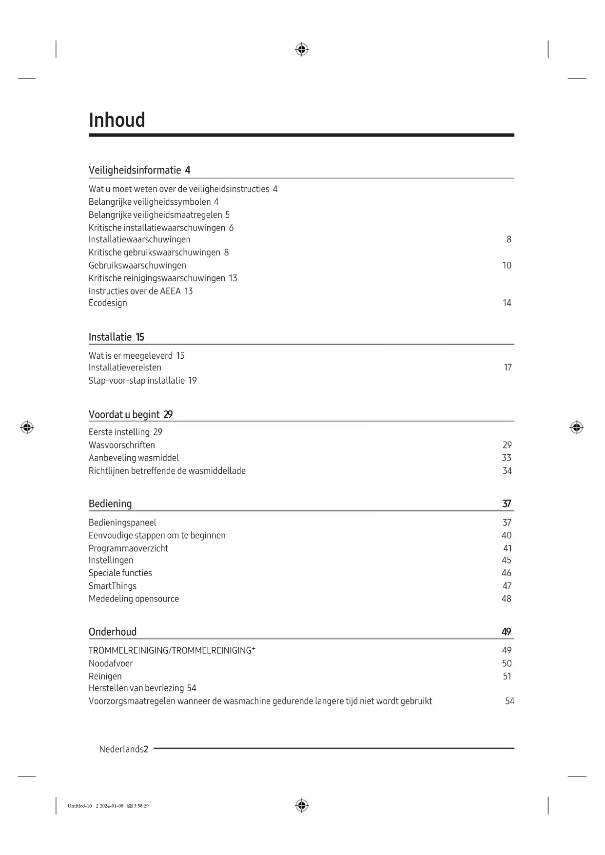 Untitled-10 1 2024-01-08 3:58:29Nederlands2 Inhoud Veiligheidsinformatie 4 Wat u moet weten over de veiligheidsinstructies 4 Belangrijke veiligheidssymbolen 4 Belangrijke veiligheidsmaatregelen 5 Kritische installatiewaarschuwingen 6 Installatiewaarschuwingen 8 Kritische gebruikswaarschuwingen 8 Gebruikswaarschuwingen 10 Kritische reinigingswaarschuwingen 13 Instructies over de AEEA 13 Ecodesign 14 Installatie 15 Wat is er meegeleverd 15 Installatievereisten 17 Stap-voor-stap installatie 19 Voordat u begint 29 Eerste instelling 29 Wasvoorschriften 29 Aanbeveling wasmiddel 33 Richtlijnen betreffende de wasmiddellade 34 Bediening 37 Bedieningspaneel 37 Eenvoudige stappen om te beginnen 40 Programmaoverzicht 41 Instellingen 45 Speciale functies 46 SmartThings 47 Mededeling opensource 48 Onderhoud 49 TROMMELREINIGING/TROMMELREINIGING⁺ 49 Noodafvoer 50 Reinigen 51 Herstellen van bevriezing 54 Voorzorgsmaatregelen wanneer de wasmachine gedurende langere tijd niet wordt gebruikt 54 Untitled-10 2 2024-01-08 3:58:29Nederlands 3 Problemen oplossen 55 Punten om te controleren 55 Informatiecodes 59 Specicaties 61 Wasvoorschriften 61 Zorg voor het milieu 63 Garantie op reserveonderdelen 63 Specicatieblad 64 EPREL-gegevens 65 Indicatieve gegevens (in navolging van EU 2019/2023) 66 Contactgegevens 67