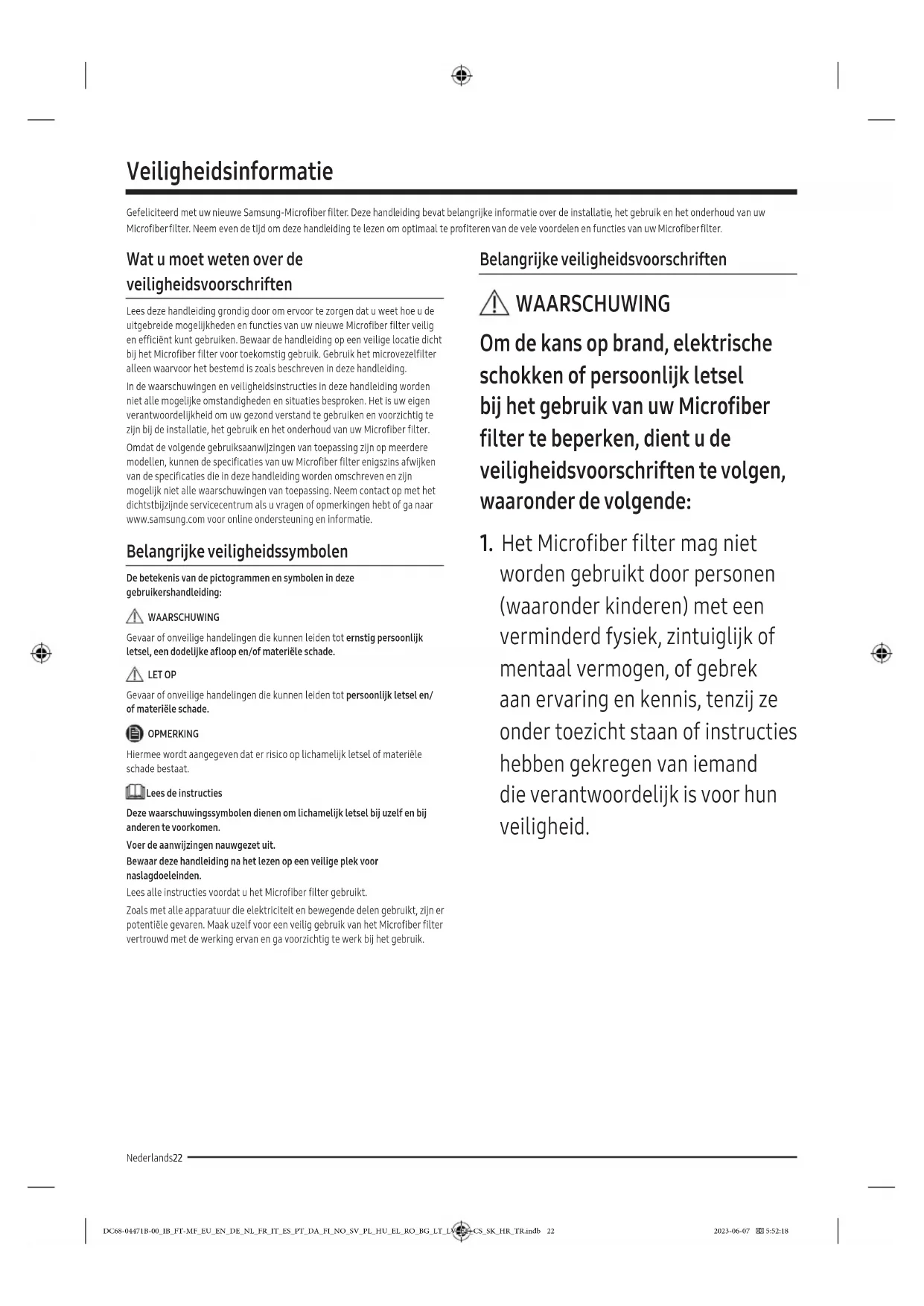 - Die hier angegebenen Abmessungen können je nach Messmethode geringfügig von den tatsächlichen Abmessungen abweichen. DC68-04471B-00_IB_FT-MF_EU_EN_DE_NL_FR_IT_ES_PT_DA_FI_NO_SV_PL_HU_EL_RO_BG_LT_LV_ET_CS_SK_HR_TR.indb 21 2023-06-07 5:52:17Nederlands22 Veiligheidsinformatie Gefeliciteerd met uw nieuwe Samsung-Microfiber filter. Deze handleiding bevat belangrijke informatie over de installatie, het gebruik en het onderhoud van uw Microfiber filter. Neem even de tijd om deze handleiding te lezen om optimaal te profiteren van de vele voordelen en functies van uw Microfiber filter. Wat u moet weten over de veiligheidsvoorschriften Lees deze handleiding grondig door om ervoor te zorgen dat u weet hoe u de uitgebreide mogelijkheden en functies van uw nieuwe Microfiber filter veilig en efficiënt kunt gebruiken. Bewaar de handleiding op een veilige locatie dicht bij het Microfiber filter voor toekomstig gebruik. Gebruik het microvezelfilter alleen waarvoor het bestemd is zoals beschreven in deze handleiding. In de waarschuwingen en veiligheidsinstructies in deze handleiding worden niet alle mogelijke omstandigheden en situaties besproken. Het is uw eigen verantwoordelijkheid om uw gezond verstand te gebruiken en voorzichtig te zijn bij de installatie, het gebruik en het onderhoud van uw Microfiber filter. Omdat de volgende gebruiksaanwijzingen van toepassing zijn op meerdere modellen, kunnen de specificaties van uw Microfiber filter enigszins afwijken van de specificaties die in deze handleiding worden omschreven en zijn mogelijk niet alle waarschuwingen van toepassing. Neem contact op met het dichtstbijzijnde servicecentrum als u vragen of opmerkingen hebt of ga naar www.samsung.com voor online ondersteuning en informatie. Belangrijke veiligheidssymbolen De betekenis van de pictogrammen en symbolen in deze gebruikershandleiding: WAARSCHUWING Gevaar of onveilige handelingen die kunnen leiden tot ernstig persoonlijk letsel, een dodelijke afloop en/of materiële schade. LET OP Gevaar of onveilige handelingen die kunnen leiden tot persoonlijk letsel en/ of materiële schade. OPMERKING Hiermee wordt aangegeven dat er risico op lichamelijk letsel of materiële schade bestaat. Lees de instructies Deze waarschuwingssymbolen dienen om lichamelijk letsel bij uzelf en bij anderen te voorkomen. Voer de aanwijzingen nauwgezet uit. Bewaar deze handleiding na het lezen op een veilige plek voor naslagdoeleinden. Lees alle instructies voordat u het Microfiber filter gebruikt. Zoals met alle apparatuur die elektriciteit en bewegende delen gebruikt, zijn er potentiële gevaren. Maak uzelf voor een veilig gebruik van het Microfiber filter vertrouwd met de werking ervan en ga voorzichtig te werk bij het gebruik. Belangrijke veiligheidsvoorschriften WAARSCHUWING Om de kans op brand, elektrische schokken of persoonlijk letsel bij het gebruik van uw Microfiber filter te beperken, dient u de veiligheidsvoorschriften te volgen, waaronder de volgende: