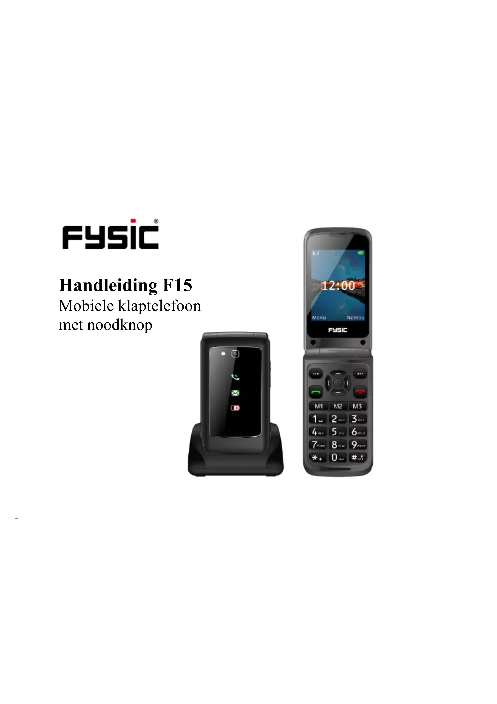 Handleiding F15 Mobiele klaptelefoon met noodknop1 Inleiding Bedankt voor de aankoop van de Fysic F15-telefoon. Deze gebruiksvriendelijke mobiele telefoon voor senioren is geschikt voor gehoorapparaten op het 4G mobiele netwerk. Het biedt vele functies zoals een SOS-alarmknop die een SMS met SOS naar noodnummers verstuurt of noodnummers belt in handsfree modus. De lettergrootte op het LCD-kleurenscherm is groot en de grote toetsen zijn gemakkelijk te zien en te gebruiken, met snelkiestoetsen, zoomfunctie, ingebouwde zaklamp, lange stand-by en gebruikstijd, kalender, rekenmachine, camera, video, FM- radio, telefoonboek, luidsprekertelefoon en geen SIM-lock. Het is belangrijk dat u de onderstaande instructies leest om uw Fysic F15 telefoon optimaal te kunnen gebruiken. Bewaar deze gebruiksaanwijzing op een veilige plaats voor toekomstig gebruik.2 Beschrijving telefoon3 Instructie over toetsen en het uiterlijk van de telefoon
