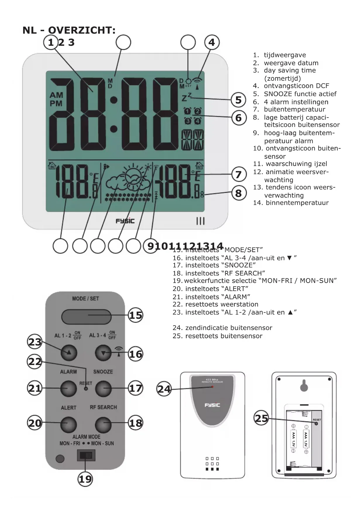 MON - SUNInstellen temperatuur alarm: Druk op toets “ALERT”(20) voor de volgende selectie: Hoog alarm actief (instelbaar van -49°C tot +70°C). Hoog en laag alarm actief. Laag alarm actief (instelbaar van -50°C tot +6°C). geen alarm actief. Druk op toets “ALERT”(20) en houdt deze minimaal 3 seconden ingedrukt totdat gaat knippe- ren. Stel met toetsen ▲(23) en ▼(16) de gewenste hoog alarm temperatuur in. Druk op toets “ALERT”(20), gaat knipperen. Stel met toetsen ▲(23) en ▼(16) de gewenste laag alarm tem- peratuur in. Druk toets “ALERT”(20) om alles vast te leggen. Als het temperatuur alarm is be- reikt zal het icoon met de temperatuur gaan knipperen ( of ). Tevens wordt er een alarmtoon hoorbaar. Druk op een willekeurige toets of wacht 2 minuten om de alarmtoon te laten stoppen. Zolang de temperatuur te hoog of te laag is als de ingestelde waarde zal de temperatuurweer- gave blijven knipperen. Komt de temperatuur uit de alarmwaarde dan stopt de temperatuur met knipperen. lage batterij capaciteit indicatie: Als de batterijen leeg raken zal de lage batterij capaciteit indicatie verschijnen . Vervang in dit geval de batterijen van de buitenunit. GEBRUIK WEERSTATION: Bij normaal gebruik worden de volgende gegevens weergegeven: klok binnen- en buitentemperatuur weersverwachting animatie tendens indicatie indicatie DCF-tijd eventueel geactiveerde alarmen. Weergave klok: Druk toets “MODE/SET”(15) herhaaldelijk voor de volgende weergave: klok klok + dag datum + dag jaar + dag Barometer tendens indicatie: De luchtdruk is hoger ten opzichte van eerder De luchtdruk is gelijk ten opzichte van eerder De luchtdruk is lager ten opzichte van eerder Weercondities: Als de weer animatie regen aangeeft maar één van de temperatuurweergaven is onder 0°C, dan zal er sneeuw worden weergegeven in de animatie. IJzel alarm: Het icoon van ijzel alarm zal op het scherm verschijnen wanneer de buitentemperatuur tussen -2°C en +3°C is. Buitensensor opnieuw zoeken: Druk op toets “RF SEARCH”(15) en houdt deze minimaal 2 seconden ingedrukt totdat de waarde van de buitensensor gaat knipperen. Het weerstation gaat opnieuw naar de buitensensor zoe- ken. D S TDCF-tijd opnieuw zoeken: Druk op toets “AL-3 - 4 “ en houdt deze minimaal 2 seconden ingedrukt totdat het DCF tijd icoon gaat knipperen. Het weerstation gaat nu het DCF-signaal opnieuw ontvangen. Elke dag om 3.00 a.m. zal het weerstation automatisch proberen te synchroniseren met de DCF-77 zender. RESET / SYSTEEM STORING: Indien u het overzicht tot de instellingen kwijt bent of het weerstation een mogelijke storing vertoont, kan het raadzaam zijn het weerstation- en buitensensor te resetten. Voor meer informatie zie: www.fysic.com PLAATSING TIPS: