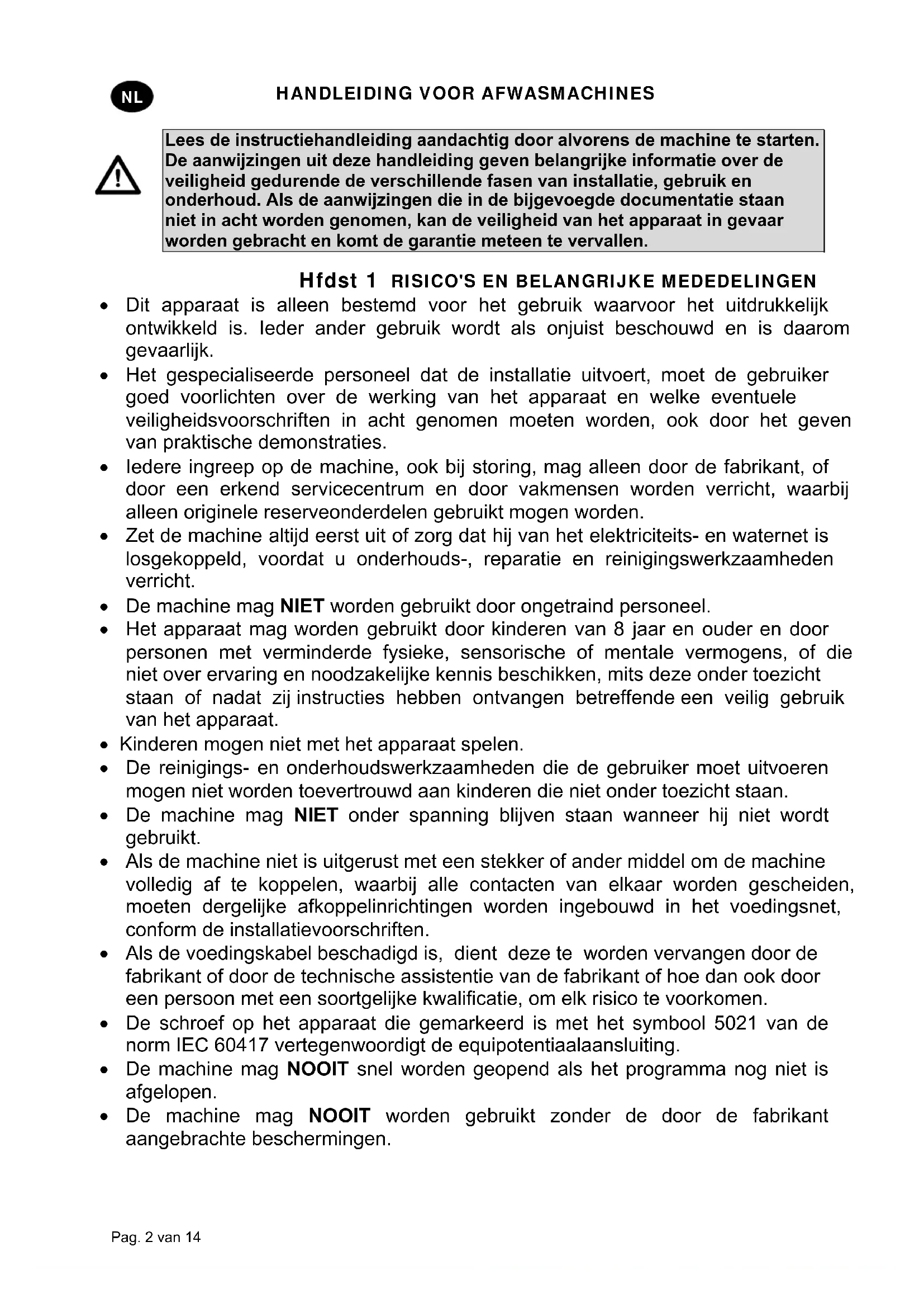 ls de voedingskabel beschadigd is, dient deze te worden vervangen door de fabrikant of door de technische assistentie van de fabrikant of hoe dan ook door een persoon met een soortgelijke kwalificatie, om elk risico te voorkomen. De schroef op het apparaat die gemarkeerd is met het symbool 5021 van de norm IEC 60417 vertegenwoordigt de equipotentiaalaansluiting. De machine mag NOOIT snel worden geopend als het programma nog niet is afgelopen. De machine mag NOOIT worden gebruikt zonder de door de fabrikant aangebrachte beschermingen.HANDLEIDING VOOR AFWASMACHINES Pag. 3 van 14
