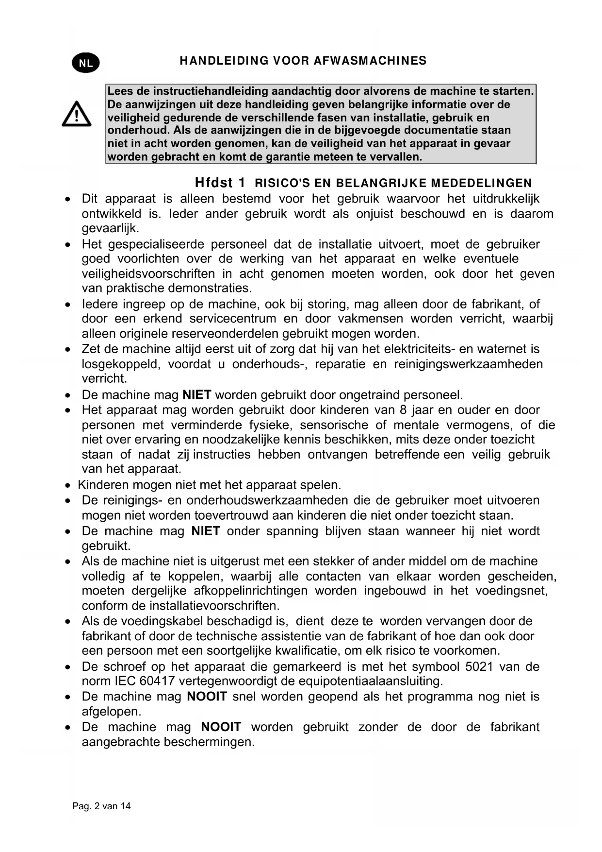 ls de voedingskabel beschadigd is, dient deze te worden vervangen door de fabrikant of door de technische assistentie van de fabrikant of hoe dan ook door een persoon met een soortgelijke kwalificatie, om elk risico te voorkomen. De schroef op het apparaat die gemarkeerd is met het symbool 5021 van de norm IEC 60417 vertegenwoordigt de equipotentiaalaansluiting. De machine mag NOOIT snel worden geopend als het programma nog niet is afgelopen. De machine mag NOOIT worden gebruikt zonder de door de fabrikant aangebrachte beschermingen.HANDLEIDING VOOR AFWASMACHINES Pag. 3 van 14