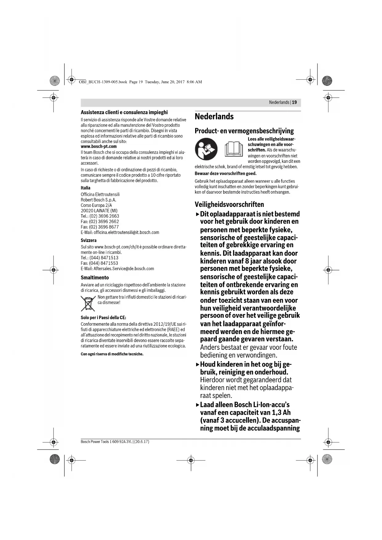 Tensione di ricarica della batteria (ri- conoscimento automatico della ten- sione) V10,8–18 Corrente di carica A1,4 Campo ammesso di temperatura di ricarica °C 0–45 Numero degli elementi della batteria ricaricabile 3–10 Peso in funzione della EPTA- Procedure 01:2014 kg 0,30 Classe di sicurezza / II Si prega di tenere presente il codice prodotto applicato sulla targhetta di costruzione della stazione di ricarica in dotazione. Le denominazioni commerciali di singole stazioni di ricarica possono essere differenti. Tempo di ricarica con autono- mia batteria ricaricabile, ca. 10,8 V 14,4 V 18 V 1,3 Ah–1,5 Ah min 65 65 80 2,0 Ah min 90 90 105 2,6 Ah–3,0 Ah min – 130 160 4,0 Ah min – 180 210 Causa Rimedi Led indicatore di carica della batteria 2 costantemente acceso Operazione di ricarica impossibile La batteria ricaricabile non è inserita (correttamente) Inserire la batteria ricaricabi- le correttamente sulla stazio- ne di ricarica I contatti delle batterie ricari- cabili sono sporchi Pulire i contatti delle batterie ricaricabili; p.es. inserendo ed estraendo più volte le bat- terie o la batteria ricaricabile Batteria ricaricabile difettosa Sostituire la batteria Led indicatore di carica della batteria 2 non è acceso La spina di collegamento alla rete della stazione di ricarica non è inserita (correttamen- te) Inserire la spina di rete (com- pletamente) nella presa per la corrente Difetto della presa per la cor- rente, del cavo di rete oppure della stazione di ricarica Controllare la tensione di rete ed, eventualmente, far con- trollare la stazione di ricarica presso un centro per il Servi- zio Clienti elettroutensili Bosch autorizzato OBJ_BUCH-1309-005.book Page 18 Tuesday, June 20, 2017 8:06 AMNederlands | 19 Bosch Power Tools 1 609 92A 3YL | (20.6.17) Assistenza clienti e consulenza impieghi Il servizio di assistenza risponde alle Vostre domande relative alla riparazione ed alla manutenzione del Vostro prodotto nonché concernenti le parti di ricambio. Disegni in vista esplosa ed informazioni relative alle parti di ricambio sono consultabili anche sul sito: www.bosch-pt.com Il team Bosch che si occupa della consulenza impieghi vi aiu- terà in caso di domande relative ai nostri prodotti ed ai loro accessori. In caso di richieste o di ordinazione di pezzi di ricambio, comunicare sempre il codice prodotto a 10 cifre riportato sulla targhetta di fabbricazione del prodotto. Italia Officina Elettroutensili Robert Bosch S.p.A. Corso Europa 2/A 20020 LAINATE (MI) Tel.: (02) 3696 2663 Fax: (02) 3696 2662 Fax: (02) 3696 8677 E-Mail: officina.elettroutensili@it.bosch.com Svizzera Sul sito www.bosch-pt.com/ch/it è possible ordinare diretta- mente on-line i ricambi. Tel.: (044) 8471513 Fax: (044) 8471553 E-Mail: Aftersales.Service@de.bosch.com Smaltimento Avviare ad un riciclaggio rispettoso dell’ambiente la stazione di ricarica, gli accessori dismessi e gli imballaggi. Non gettare tra i rifiuti domestici le stazioni di ricari- ca dismesse! Solo per i Paesi della CE: Conformemente alla norma della direttiva 2012/19/UE sui ri- fiuti di apparecchiature elettriche ed elettroniche (RAEE) ed all’attuazione del recepimento nel diritto nazionale, le stazioni di ricarica diventate inservibili devono essere raccolte sepa- ratamente ed essere inviate ad una riutilizzazione ecologica. Con ogni riserva di modifiche tecniche. Nederlands Product- en vermogensbeschrijving Lees alle veiligheidswaar- schuwingen en alle voor- schriften. Als de waarschu- wingen en voorschriften niet worden opgevolgd, kan dit een elektrische schok, brand of ernstig letsel tot gevolg hebben. Bewaar deze voorschriften goed. Gebruik het oplaadapparaat alleen wanneer u alle functies volledig kunt inschatten en zonder beperkingen kunt gebrui- ken of daarvoor bestemde instructies heeft ontvangen. Veiligheidsvoorschriften Dit oplaadapparaat is niet bestemd voor het gebruik door kinderen en personen met beperkte fysieke, sensorische of geestelijke capaci- teiten of gebrekkige ervaring en kennis. Dit laadapparaat kan door kinderen vanaf 8 jaar alsook door personen met beperkte fysieke, sensorische of geestelijke capaci- teiten of ontbrekende ervaring en kennis gebruikt worden als deze onder toezicht staan van een voor hun veiligheid verantwoordelijke persoon of over het veilige gebruik van het laadapparaat geïnfor- meerd werden en de hiermee ge- paard gaande gevaren verstaan. Anders bestaat er gevaar voor foute bediening en verwondingen. Houd kinderen in het oog bij ge- bruik, reiniging en onderhoud. Hierdoor wordt gegarandeerd dat kinderen niet met het oplaadappa- raat spelen. Laad alleen Bosch Li-Ion-accu’s vanaf een capaciteit van 1,3 Ah (vanaf 3 accucellen). De accuspan- ning moet bij de acculaadspanning OBJ_BUCH-1309-005.book Page 19 Tuesday, June 20, 2017 8:06 AM20 | Nederlands 1 609 92A 3YL | (20.6.17) Bosch Power Tools van het oplaadapparaat passen. Laad geen batterijen die niet op- laadbaar zijn. Anders bestaat er brand- en explosiegevaar. Houd het oplaadapparaat uit de buurt van regen en vocht. Het binnendringen van water in het op- laadapparaat vergroot het risico van een elektri- sche schok. Houd het oplaadapparaat schoon. Door vervuiling be- staat gevaar voor een elektrische schok. Controleer voor elk gebruik oplaadapparaat, kabel en stekker. Gebruik het oplaadapparaat niet als u een be- schadiging hebt vastgesteld. Open het oplaadapparaat niet zelf en laat het alleen door gekwalificeerd perso- neel en alleen met originele vervangingsonderdelen re- pareren. Beschadigde oplaadapparaten, kabels en stek- kers vergroten het risico van een elektrische schok. Gebruik het oplaadapparaat niet op een gemakkelijk brandbare ondergrond (zoals papier of textiel) of in een brandbare omgeving. Vanwege de bij het opladen optredende verwarming van het oplaadapparaat bestaat brandgevaar. Bij beschadiging en onjuist gebruik van de accu kunnen er dampen vrijkomen. Zorg voor frisse lucht en raad- pleeg bij klachten een arts. De 