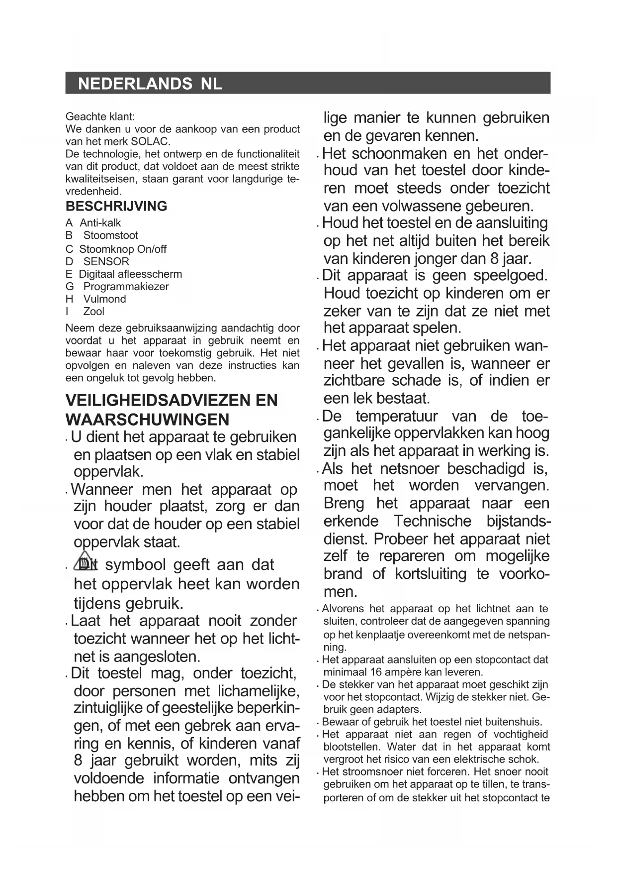 - Il prodotto non contiene sostanze dannose per l’ambiente. Questo simbolo indica che, per smaltire il prodo- tto al termine della sua durata utile, occorre depositarlo presso un ente di smaltimento autorizzato alla raccolta differenziata di ri- uti di apparecchiature elettriche ed elettroniche (RAEE). Questo apparecchio rispetta la Direttiva 2014/35/ UE di Bassa Tensione, la Direttiva 2014/30/UE di Compatibilità Elettromagnetica, la Direttiva 2011/65/UE sui limiti d’impiego di determinate sostanze pericolose negli apparecchi elettrici ed elettronici e la Direttiva 2009/125/CE riguardante l’Ecodesign dei prodotti che consumano energia. ITNEDERLANDS NL Geachte klant: We danken u voor de aankoop van een product van het merk SOLAC. De technologie, het ontwerp en de functionaliteit van dit product, dat voldoet aan de meest strikte kwaliteitseisen, staan garant voor langdurige te- vredenheid. BESCHRIJVING A Anti-kalk B Stoomstoot C Stoomknop On/off D SENSOR E Digitaal aeesscherm G Programmakiezer H Vulmond I Zool Neem deze gebruiksaanwijzing aandachtig door voordat u het apparaat in gebruik neemt en bewaar haar voor toekomstig gebruik. Het niet opvolgen en naleven van deze instructies kan een ongeluk tot gevolg hebben. VEILIGHEIDSADVIEZEN EN WAARSCHUWINGEN