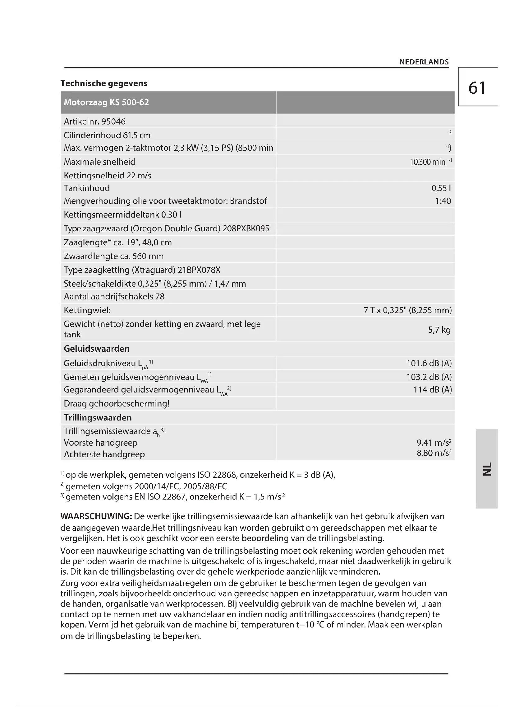 Kettingsnelheid 22 m/s Tankinhoud Mengverhouding olie voor tweetaktmotor: Brandstof 0,55 l 1:40 Kettingsmeermiddeltank 0.30 l Type zaagzwaard (Oregon Double Guard) 208PXBK095 Zaaglengte* ca. 19”, 48,0 cm Zwaardlengte ca. 560 mm Type zaagketting (Xtraguard) 21BPX078X Steek/schakeldikte 0,325" (8,255 mm) / 1,47 mm Aantal aandrijfschakels 78 Kettingwiel: 7 T x 0,325" (8,255 mm) Gewicht (netto) zonder ketting en zwaard, met lege tank 5,7 kg Geluidswaarden Geluidsdrukniveau L