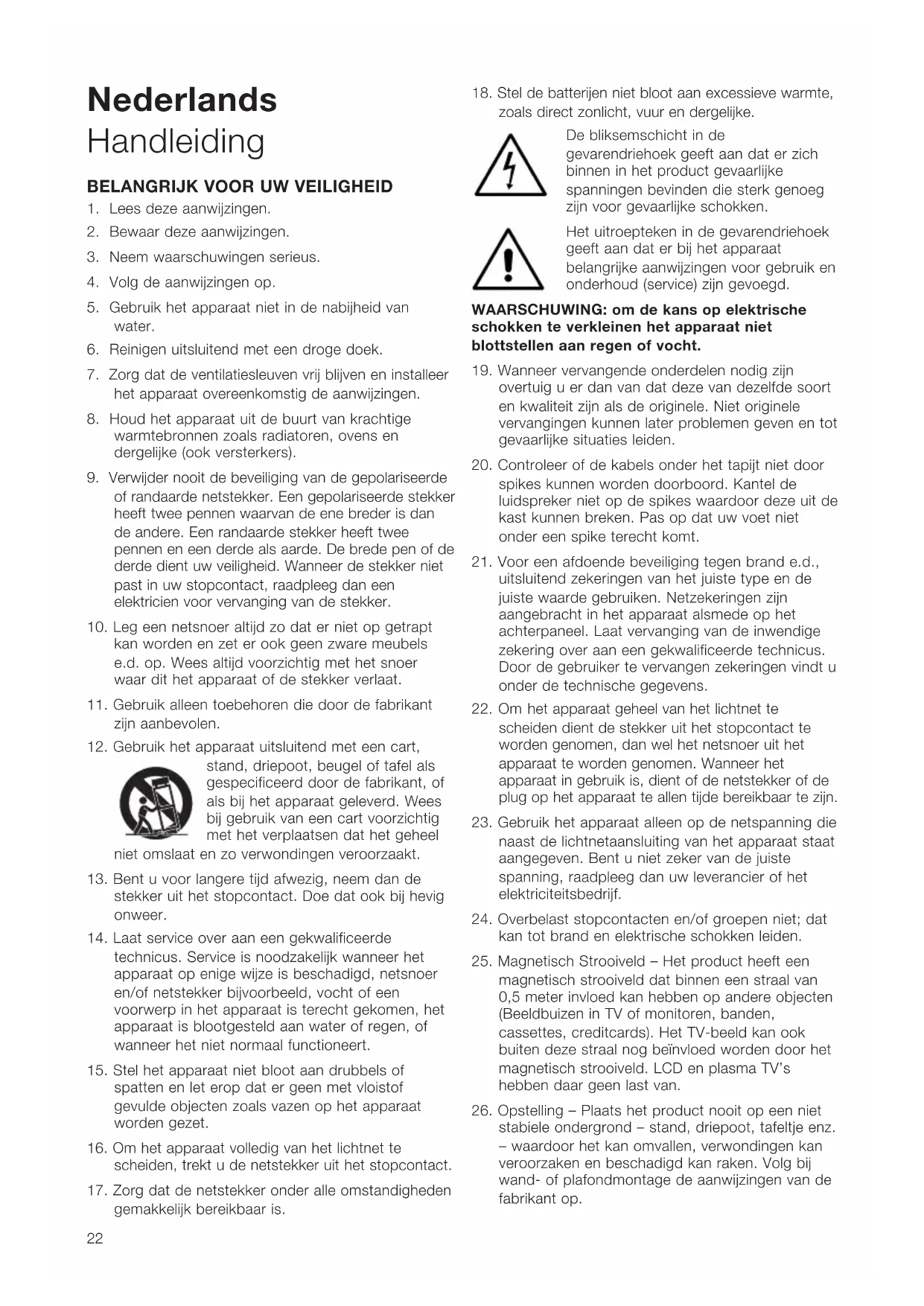 zoals direct zonlicht, vuur en dergelijke. De bliksemschicht in de gevarendriehoek geeft aan dat er zich binnen in het product gevaarlijke spanningen bevinden die sterk genoeg zijn voor gevaarlijke schokken. Het uitroepteken in de gevarendriehoek geeft aan dat er bij het apparaat belangrijke aanwijzingen voor gebruik en onderhoud (service) zijn gevoegd. WAARSCHUWING: om de kans op elektrische schokken te verkleinen het apparaat niet blottstellen aan regen of vocht.