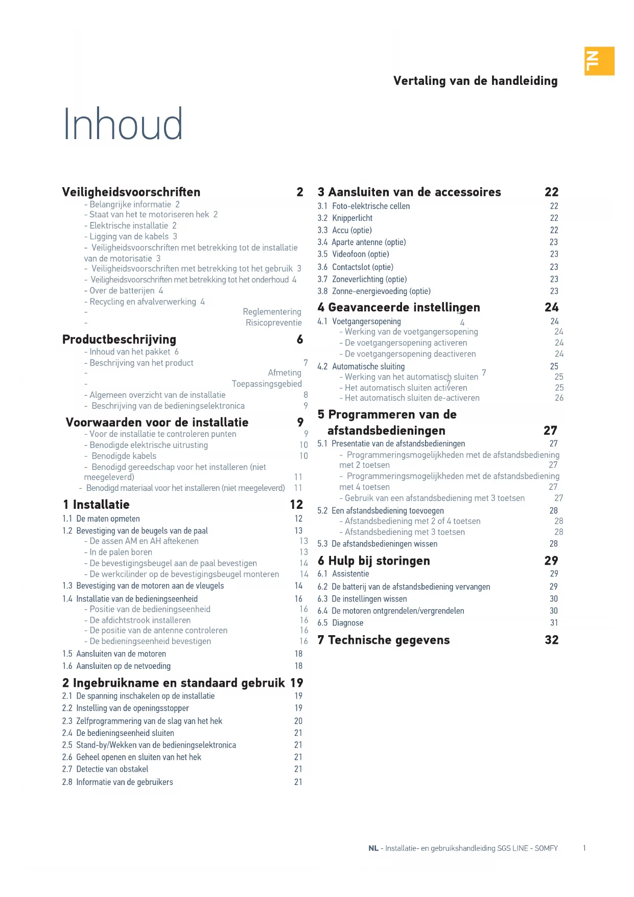 Informeer altijd alle gebruikers over het veilig gebruiken van dit hek (standaard gebruik en ontgrendelingsprincipe) en over de verplichte periodieke controles.22 NL - Installatie- en gebruikshandleiding SGS LINE - SOMFY