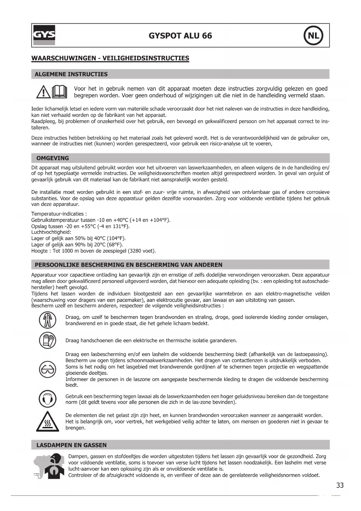 Dampen, gassen en stofdeeltjes die worden uitgestoten tijdens het lassen zijn gevaarlijk voor de gezondheid. Zorg voor voldoende ventilatie, soms is toevoer van verse lucht tijdens het lassen noodzakelijk. Een lashelm met verse lucht-aanvoer kan een oplossing zijn als er onvoldoende ventilatie is.Controleer of de afzuigkracht voldoende is, en verifieer of deze aan de gerelateerde veiligheidsnormen voldoet.34 GYSPOT ALU 66