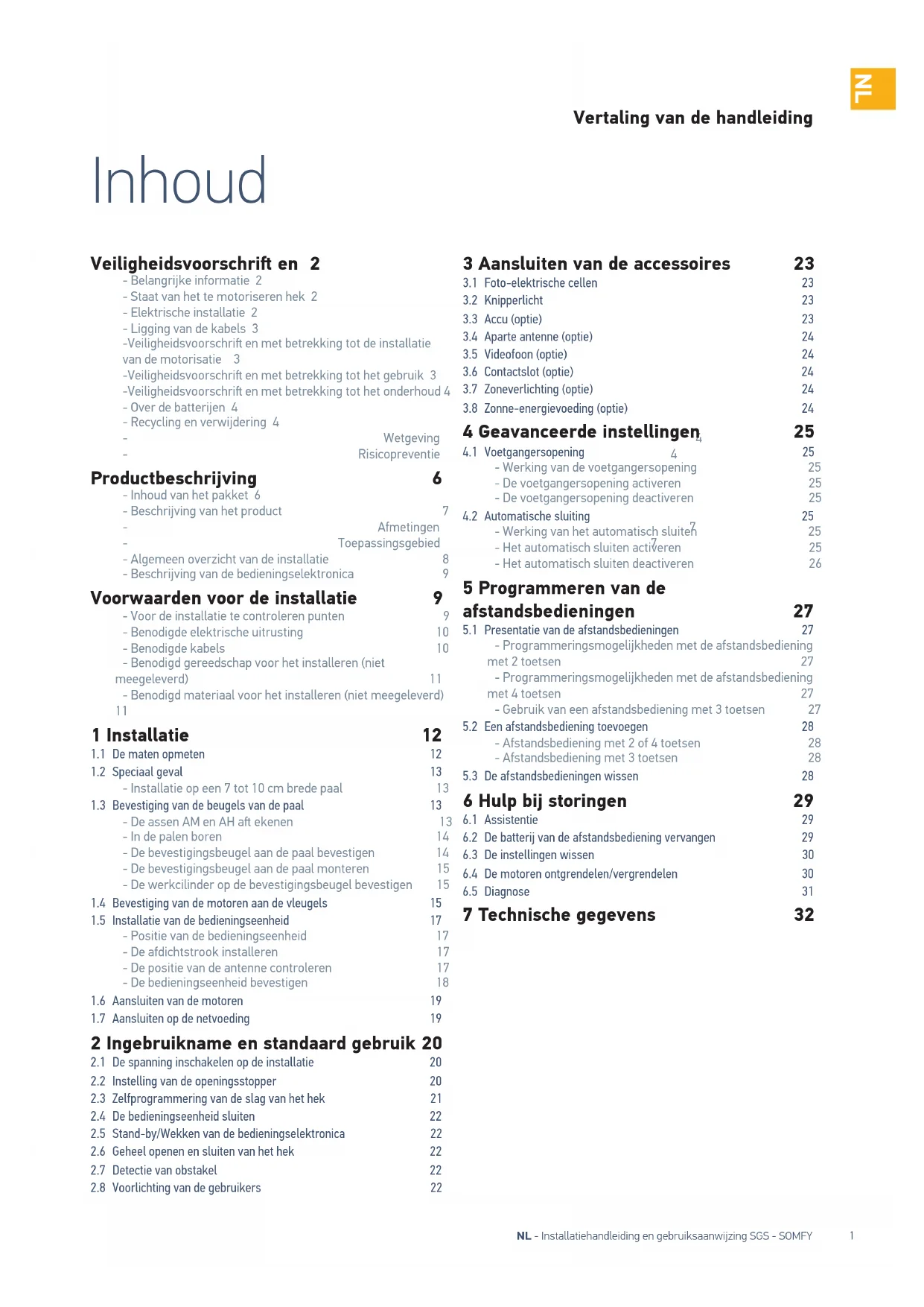 Vertaling van de handleiding Inhoud Veiligheidsvoorschri en 2 - Belangrijke informatie 2 - Staat van het te motoriseren hek 2 - Elektrische installatie 2 - Ligging van de kabels 3 - Veiligheidsvoorschri en met betrekking tot de installatie van de motorisatie 3 - Veiligheidsvoorschri en met betrekking tot het gebruik 3 - Veiligheidsvoorschri en met betrekking tot het onderhoud 4 - Over de batterijen 4 - Recycling en verwijdering 4 - Wetgeving 4 - Risicopreventie 4 Productbeschrijving 6 - Inhoud van het pakket 6 - Beschrijving van het product 7 - Afmetingen 7 - Toepassingsgebied 7 - Algemeen overzicht van de installatie 8 - Beschrijving van de bedieningselektronica 9 Voorwaarden voor de installatie 9 - Voor de installatie te controleren punten 9 - Benodigde elektrische uitrusting 10 - Benodigde kabels 10 - Benodigd gereedschap voor het installeren (niet meegeleverd) 11 - Benodigd materiaal voor het installeren (niet meegeleverd)