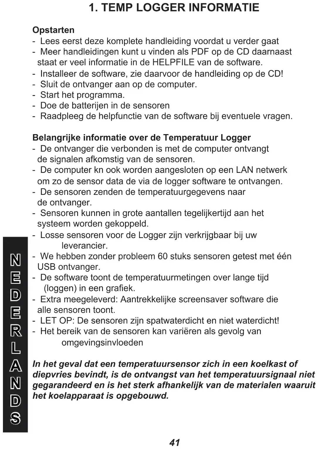 Opstarten - Lees eerst deze komplete handleiding voordat u verder gaat - Meer handleidingen kunt u vinden als PDF op de CD daarnaast staat er veel informatie in de HELPFILE van de software. - Installeer de software, zie daarvoor de handleiding op de CD! - Sluit de ontvanger aan op de computer. - Start het programma. - Doe de batterijen in de sensoren - Raadpleeg de helpfunctie van de software bij eventuele vragen. Belangrijke informatie over de Temperatuur Logger - De ontvanger die verbonden is met de computer ontvangt de signalen afkomstig van de sensoren. - De computer kn ook worden aangesloten op een LAN netwerk om zo de sensor data de via de logger software te ontvangen. - De sensoren zenden de temperatuurgegevens naar de ontvanger. - Sensoren kunnen in grote aantallen tegelijkertijd aan het systeem worden gekoppeld. - Losse sensoren voor de Logger zijn verkrijgbaar bij uw leverancier. - We hebben zonder probleem 60 stuks sensoren getest met één USB ontvanger. - De software toont de temperatuurmetingen over lange tijd (loggen)ineengraek. - Extra meegeleverd: Aantrekkelijke screensaver software die alle sensoren toont. - LET OP: De sensoren zijn spatwaterdicht en niet waterdicht! - Het bereik van de sensoren kan variëren als gevolg van omgevingsinvloeden In het geval dat een temperatuursensor zich in een koelkast of diepvries bevindt, is de ontvangst van het temperatuursignaal niet gegarandeerd en is het sterk afhankelijk van de materialen waaruit het koelapparaat is opgebouwd.