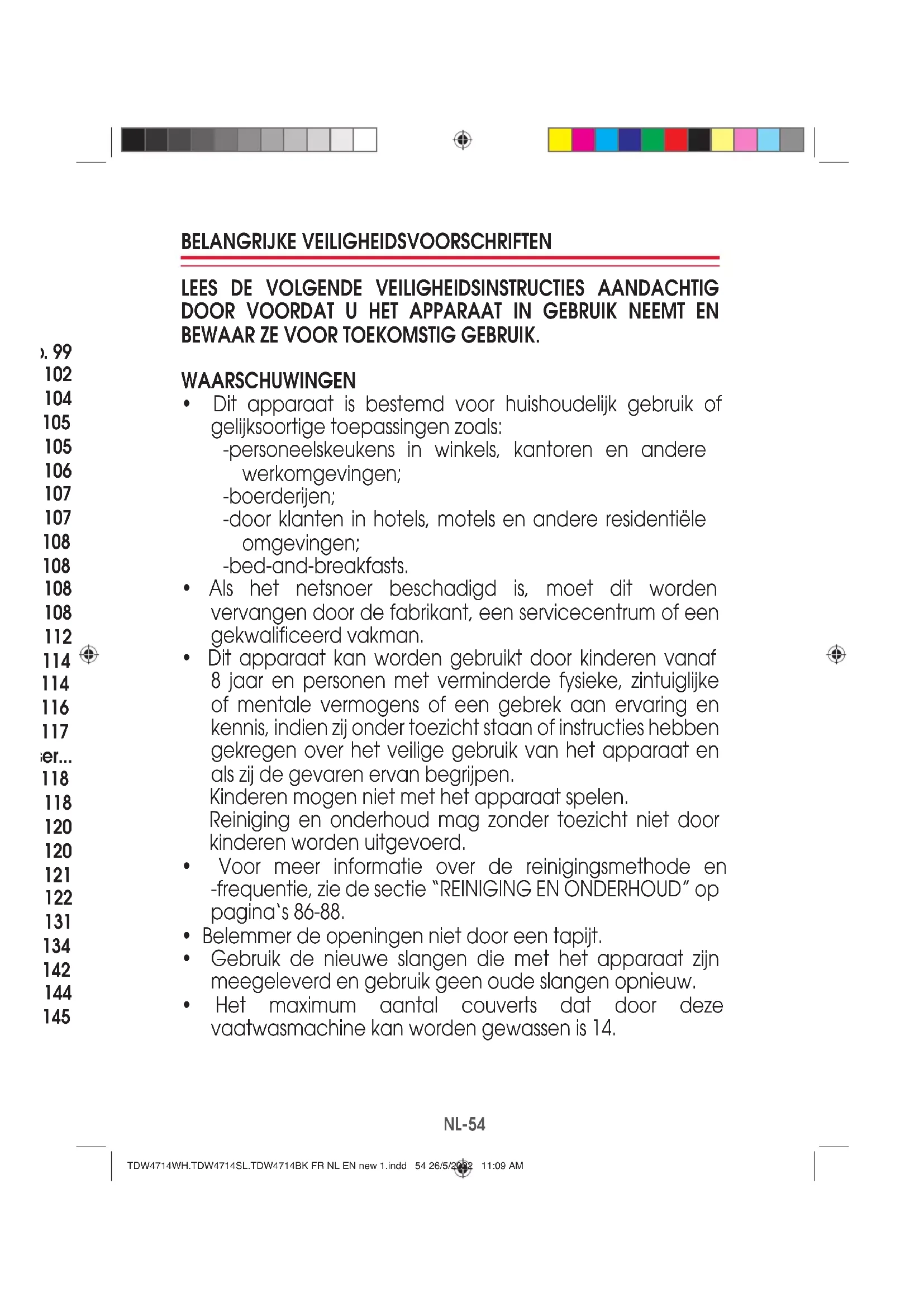 Aardingsinstructies: - Dit apparaat moet geaard zijn. In geval van een storing of defect beperkt de aarding het risico op een elektrische schok door te zorgen voor een weg van minste weerstand voor de elektrische stroom. Dit apparaat is voorzien van een geaarde stekker. - Steek de stekker in een gepast stopcontact dat volgens alle lokale codes en voorschriften is geïnstalleerd en geaard. - Een onjuiste aansluiting van de aardleiding kan resulteren in een risico op een elektrische schok. - Vraag advies aan een bekwame elektricien of reparateur als u twijfelt of het apparaat al dan niet juist geaard is. - Verander niets aan de stekker van het apparaat. Als deze niet past, vraag aan een vakbekwame elektricien om een geschikt stopcontact te installeren. TDW4714WH.TDW4714SL.TDW4714BK FR NL EN new 1.indd 56 26/5/2022 11:09 AMNL-57 57