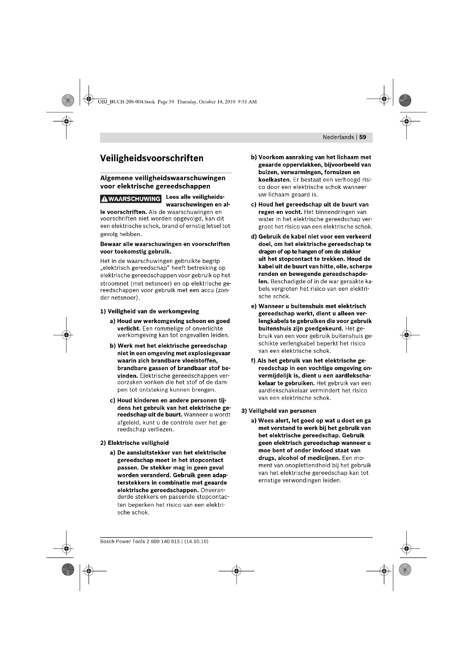 bruik van elektrische gereedschappen a) Overbelast het gereedschap niet. Ge- bruik voor uw werkzaamheden het daar- voor bestemde elektrische gereedschap. Met het passende elektrische gereed- schap werkt u beter en veiliger binnen het aangegeven capaciteitsbereik. b) Gebruik geen elektrisch gereedschap waarvan de schakelaar defect is. Elek- trisch gereedschap dat niet meer kan wor- den in- of uitgeschakeld, is gevaarlijk en moet worden gerepareerd. c) Trek de stekker uit het stopcontact of neem de accu uit het elektrische gereed- schap voordat u het gereedschap instelt, toebehoren wisselt of het gereedschap weglegt. Deze voorzorgsmaatregel voor- komt onbedoeld starten van het elektri- sche gereedschap. d) Bewaar niet-gebruikte elektrische ge- reedschappen buiten bereik van kinde- ren. Laat het gereedschap niet gebrui- ken door personen die er niet mee vertrouwd zijn en deze aanwijzingen niet hebben gelezen. Elektrische gereed- schappen zijn gevaarlijk wanneer deze door onervaren personen worden ge- bruikt. e) Verzorg het elektrische gereedschap zorgvuldig. Controleer of bewegende de- len van het gereedschap correct functio- neren en niet vastklemmen en of onder- delen zodanig gebroken of beschadigd zijn dat de werking van het elektrische gereedschap nadelig wordt beïnvloed. Laat deze beschadigde onderdelen voor het gebruik repareren. Veel ongevallen hebben hun oorzaak in slecht onderhou- den elektrische gereedschappen. f) Houd snijdende inzetgereedschappen scherp en schoon. Zorgvuldig onderhou- den snijdende inzetgereedschappen met scherpe snijkanten klemmen minder snel vast en zijn gemakkelijker te geleiden. OBJ_BUCH-208-004.book Page 60 Thursday, October 14, 2010 9:51 AMNederlands | 61 Bosch Power Tools 2 609 140 815 | (14.10.10) g) Gebruik elektrisch gereedschap, toebe- horen, inzetgereedschappen en dergelij- ke volgens deze aanwijzingen. Let daar- bij op de arbeidsomstandigheden en de uit te voeren werkzaamheden. Het ge- bruik van elektrische gereedschappen voor andere dan de voorziene toepassin- gen kan tot gevaarlijke situaties leiden.