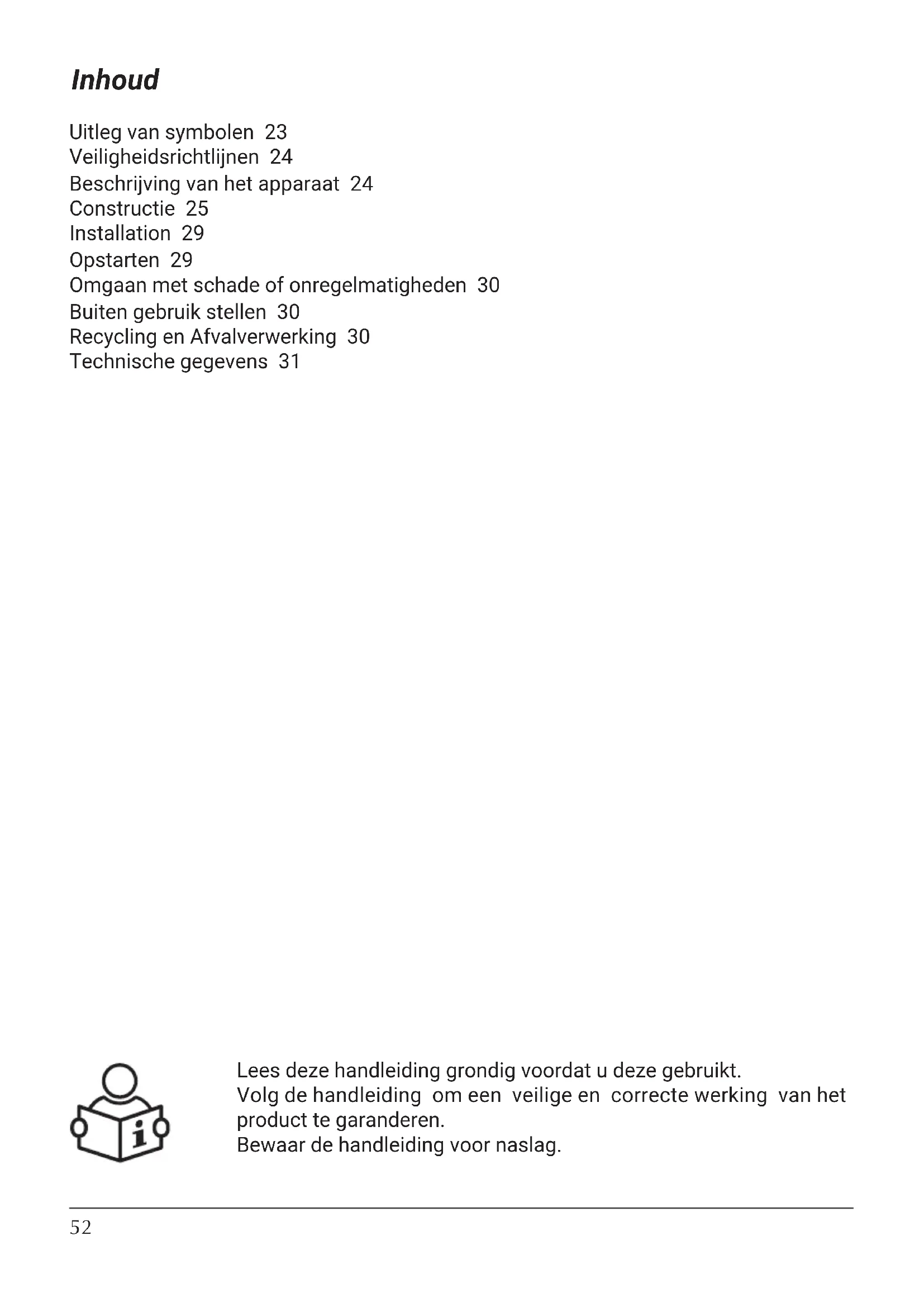 65* - 90* - 105* 7** 14** 16** 21** - 28* - 32** Poids sans eau kg 53 69 56 85 86 118 96 131 128 170 150 196 FR52 Inhoud Uitleg van symbolen 23 Veiligheidsrichtlijnen 24 Beschrijving van het apparaat 24 Constructie 25 Installation 29 Opstarten 29 Omgaan met schade of onregelmatigheden 30 Buiten gebruik stellen 30 Recycling en Afvalverwerking 30 Technische gegevens 31 Lees deze handleiding grondig voordat u deze gebruikt. Volg de handleiding om een veilige en correcte werking van het product te garanderen. Bewaar de handleiding voor naslag.53 PL;DE;EN;ES;FR;NL;HR;HU;RO-061_f.1973 Volg de veiligheidsinstructies zorgvuldig om letsel en schade te voorkomen. Gevaar Dit teken waarschuwt voor een gevaarlijke situatie. Let op Dit teken waarschuwt tegen schade aan eigendommen en milieuvervuiling. Tip Tekst gemarkeerd met het woord Tip bevat aanvullende informatie. Raadpleeg deze handleiding bij het bedienen van het product of de bedieningselementen die met dit symbool zijn gelabeld. Toepasselijke wetten en regelgeving