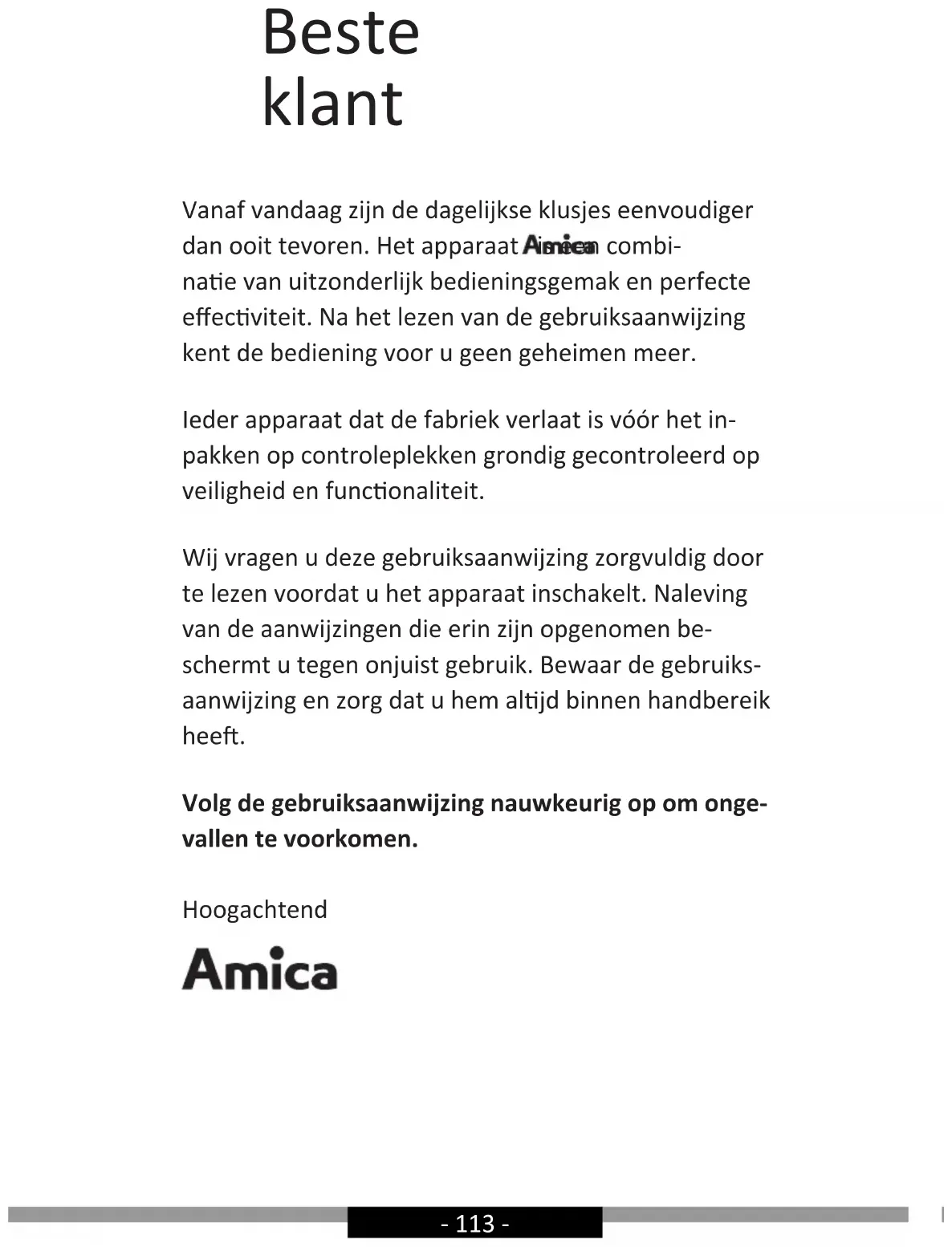 - directive RoHS 2011/65/CE et c’est le pourquoi le produit est désigné par le symbol ainsi qu’une déclaration de la conformité accessible aux organes chargés de la surveillance du marché a été délivrée.- 113 - Beste klant Vanaf vandaag zijn de dagelijkse klusjes eenvoudiger dan ooit tevoren. Het apparaat is een combi- nae van uitzonderlijk bedieningsgemak en perfecte eecviteit. Na het lezen van de gebruiksaanwijzing kent de bediening voor u geen geheimen meer. Ieder apparaat dat de fabriek verlaat is vóór het in- pakken op controleplekken grondig gecontroleerd op veiligheid en funconaliteit. Wij vragen u deze gebruiksaanwijzing zorgvuldig door te lezen voordat u het apparaat inschakelt. Naleving van de aanwijzingen die erin zijn opgenomen be- schermt u tegen onjuist gebruik. Bewaar de gebruiks- aanwijzing en zorg dat u hem aljd binnen handbereik hee. Volg de gebruiksaanwijzing nauwkeurig op om onge- vallen te voorkomen. Hoogachtend- 114 - AANWIJZINGEN BETREF-