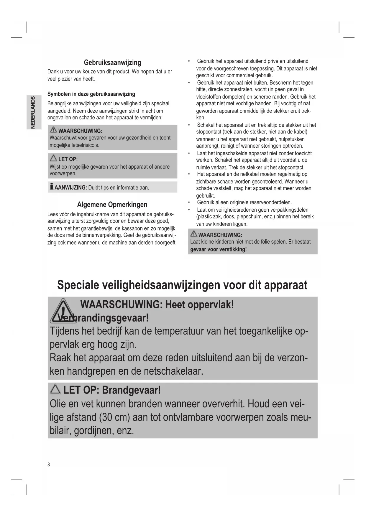 - Laatomveiligheidsredenengeenverpakkingsdelen (plastic zak, doos, piepschuim, enz.) binnen het bereik van uw kinderen liggen. WAARSCHUWING: Laat kleine kinderen niet met de folie spelen. Er bestaat gevaar voor verstikking! Speciale veiligheidsaanwijzingen voor dit apparaat WAARSCHUWING: Heet oppervlak! Verbrandingsgevaar! Tijdens het bedrijf kan de temperatuur van het toegankelijke op- pervlak erg hoog zijn. Raak het apparaat om deze reden uitsluitend aan bij de verzon- ken handgrepen en de netschakelaar. LET OP: Brandgevaar! Olieenvetkunnenbrandenwanneeroververhit.Houdeenvei- lige afstand (30 cm) aan tot ontvlambare voorwerpen zoals meu- bilair, gordijnen, enz.9 NeDeRLANDs LET OP: Dit apparaat is niet bedoeld om bij reiniging in water gedompeld te worden. Neem de aanwijzingen uit hoofdstuk “Reiniging” in acht.
