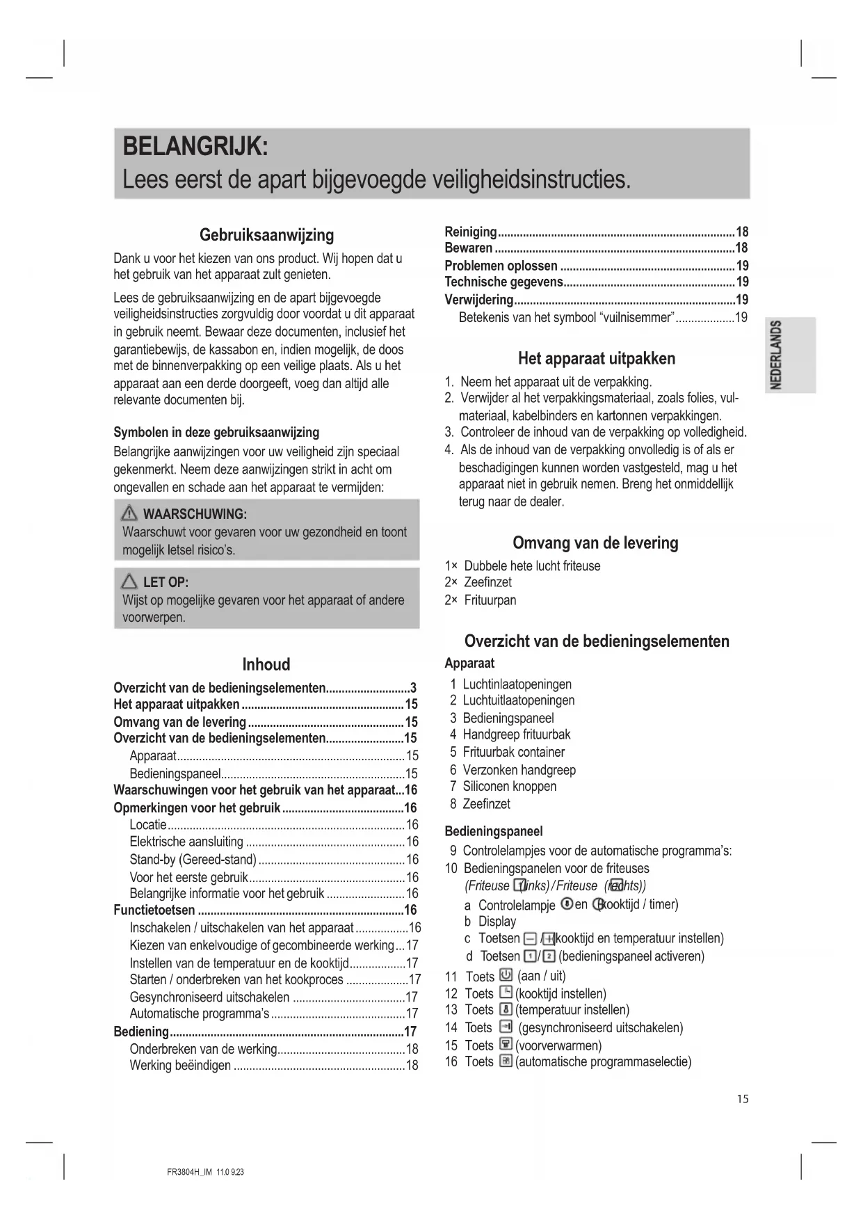 beschadigingen kunnen worden vastgesteld, mag u het apparaat niet in gebruik nemen. Breng het onmiddellijk terug naar de dealer. Omvang van de levering 1× Dubbele hete lucht friteuse 2× Zeenzet 2× Frituurpan Overzicht van de bedieningselementen Apparaat 1 Luchtinlaatopeningen 2 Luchtuitlaatopeningen 3 Bedieningspaneel 4 Handgreep frituurbak 5 Frituurbak container 6 Verzonken handgreep 7 Siliconen knoppen 8 Zeenzet Bedieningspaneel 9 Controlelampjes voor de automatische programma’s: 10 Bedieningspanelen voor de friteuses (Friteuse (links) / Friteuse (rechts)) a Controlelampje en (kooktijd / timer) b Display c Toetsen / (kooktijd en temperatuur instellen) d Toetsen / (bedieningspaneel activeren) 11 Toets (aan / uit) 12 Toets (kooktijd instellen) 13 Toets (temperatuur instellen) 14 Toets (gesynchroniseerd uitschakelen) 15 Toets (voorverwarmen) 16 Toets (automatische programmaselectie)FR3804H_IM 11.0 9.23