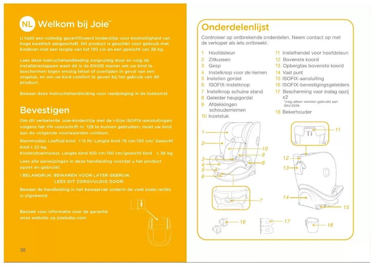 U hebt een volledig gecertificeerd kinderzitje voor kindveiligheid van hoge kwaliteit aangeschaft. Dit product is geschikt voor gebruik met kinderen met een lengte van tot 150 cm en een gewicht van 36 kg.Lees deze instructiehandleiding zorgvuldig door en volg de installatiestappen want dit is de ENIGE manier om uw kind te beschermen tegen ernstig letsel of overlijden in geval van een ongeluk﹐ en om uw kind comfort te geven bij het gebruik van dit product.Bewaar deze instructiehandleiding voor raadpleging in de toekomst. Bevestigen Om dit verbeterde Joie-kinderzitje met de i-Size ISOFIX-aansluitingen volgens het VN-voorschrift nr. 129 te kunnen gebruiken﹐ moet uw kind aan de volgende voorwaarden voldoen.Riemmodus: Leeftijd kind 15 M/ Lengte kind 76 cm-105 cm/ Gewicht kind 22 kg;Kinderstoelmodus: Lengte kind 100 cm-150 cm/gewicht kind 36 kg;Lees alle aanwijzingen in deze handleiding voordat u het product opzet en gebruikt.! BELANGRIJK: BEWAREN VOOR LATER GEBRUIK.LEES DIT ZORGVULDIG DOOR.Bewaar de handleiding in het bewaarvak onderin de voet zoals rechts is afgebeeld.Bezoek voor informatie over de garantie onze website op joiebaby.com Onderdelenlijst 1 Hoofdsteun2 Zitkussen3 Gesp 4 Instelknop voor de riemen 5 Instellen gordel6 ISOFIX-instelknop7 Instelknop schuine stand8 Geleider heupgordel9 Afdekkingen schouderriemen10 Inzetstuk11 Instelhendel voor hoofdsteun12 Bovenste koord13 Opbergtas bovenste koord14 Vast punt15 ISOFIX-aansluiting16 ISOFIX-bevestigingsgeleiders17 Bescherming voor inslag opzij *mag alleen worden gebruikt aan deurzijde18 BekerhouderControleer op ontbrekende onderdelen. Neem contact op met de verkoper als iets ontbreekt.