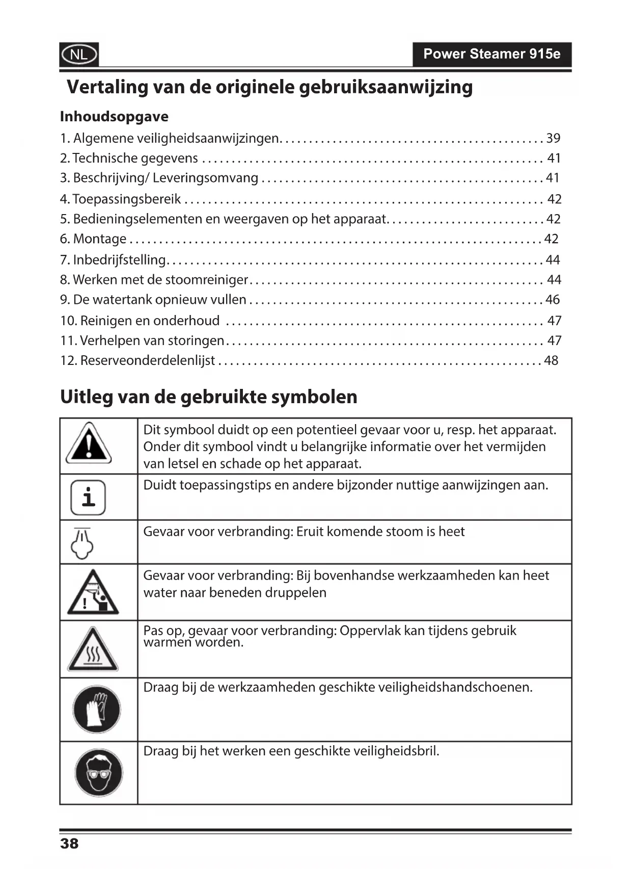 Power Steamer 915e PAS OP: LETSELGEVAAR! Bij werkzaamheden met hete stoom (ca. 100°C) bestaat gevaar voor ernstige verbranding. Stoom niet op mensen, dieren, elektrische apparaten, stopcontacten en temperatuurgevoelige voorwerpen richten. Mondstukken en borstels tijdens het bedrijf niet aanraken. Draag altijd een geschikte veiligheidsuitrusting en handschoenen.