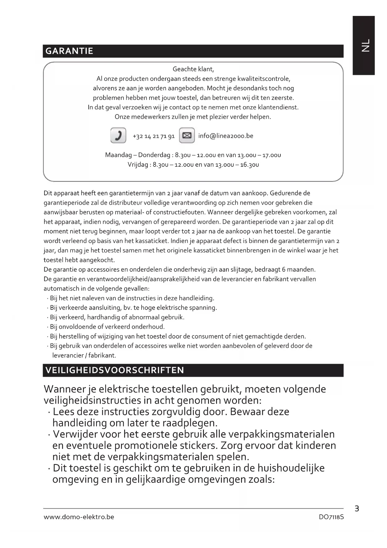 GARANTIE Geachte klant, Al onze producten ondergaan steeds een strenge kwaliteitscontrole, alvorens ze aan je worden aangeboden. Mocht je desondanks toch nog problemen hebben met jouw toestel, dan betreuren wij dit ten zeerste. In dat geval verzoeken wij je contact op te nemen met onze klantendienst. Onze medewerkers zullen je met plezier verder helpen. +32 14 21 71 91 info@linea2000.be Maandag – Donderdag : 8.30u – 12.00u en van 13.00u – 17.00u Vrijdag : 8.30u – 12.00u en van 13.00u – 16.30u Dit apparaat heeft een garantietermijn van 2 jaar vanaf de datum van aankoop. Gedurende de garantieperiode zal de distributeur volledige verantwoording op zich nemen voor gebreken die aanwijsbaar berusten op materiaal- of constructiefouten. Wanneer dergelijke gebreken voorkomen, zal het apparaat, indien nodig, vervangen of gerepareerd worden. De garantieperiode van 2 jaar zal op dit moment niet terug beginnen, maar loopt verder tot 2 jaar na de aankoop van het toestel. De garantie wordt verleend op basis van het kassaticket. Indien je apparaat defect is binnen de garantietermijn van 2 jaar, dan mag je het toestel samen met het originele kassaticket binnenbrengen in de winkel waar je het toestel hebt aangekocht. De garantie op accessoires en onderdelen die onderhevig zijn aan slijtage, bedraagt 6 maanden. De garantie en verantwoordelijkheid/aansprakelijkheid van de leverancier en fabrikant vervallen automatisch in de volgende gevallen: