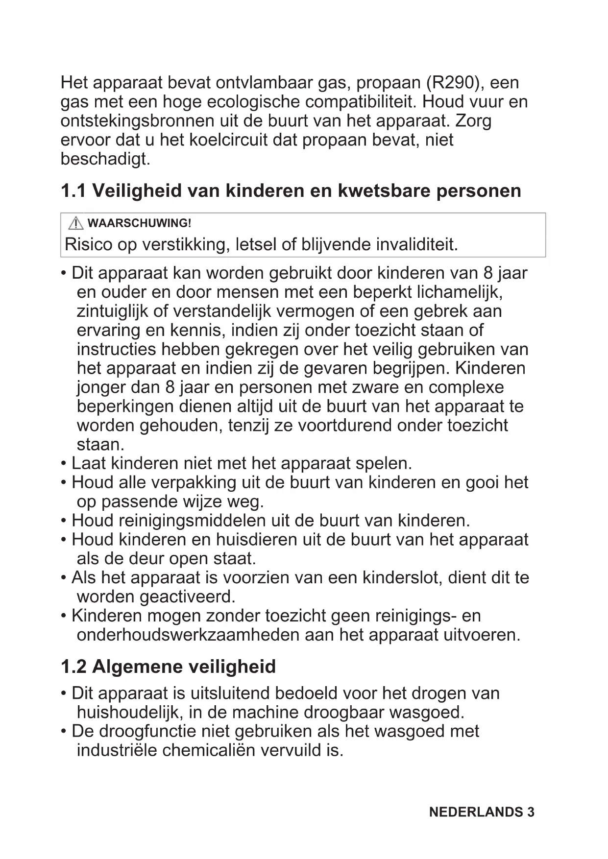 Lees zorgvuldig de meegeleverde instructies voor u het apparaat gaat installeren en gebruiken. De fabrikant is niet verantwoordelijk voor verwondingen of schade die voortvloeien uit de onjuiste installatie of het onjuiste gebruik. Bewaar de instructies altijd op een veilige en toegankelijke locatie voor toekomstig gebruik en download de volledige versie die online beschikbaar is. Waarschuwing: Brandgevaar / Ontvlambare materialen. 2 NEDERLANDSHet apparaat bevat ontvlambaar gas, propaan (R290), een gas met een hoge ecologische compatibiliteit. Houd vuur en ontstekingsbronnen uit de buurt van het apparaat. Zorg ervoor dat u het koelcircuit dat propaan bevat, niet beschadigt.