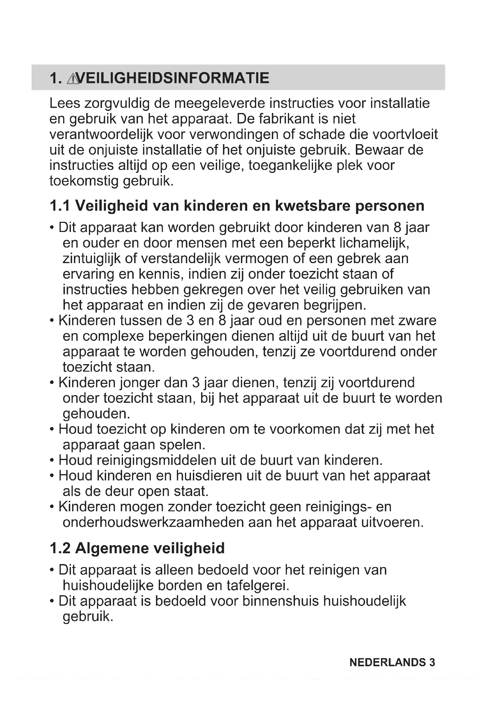 2 NEDERLANDS1. VEILIGHEIDSINFORMATIE Lees zorgvuldig de meegeleverde instructies voor installatie en gebruik van het apparaat. De fabrikant is niet verantwoordelijk voor verwondingen of schade die voortvloeit uit de onjuiste installatie of het onjuiste gebruik. Bewaar de instructies altijd op een veilige, toegankelijke plek voor toekomstig gebruik.