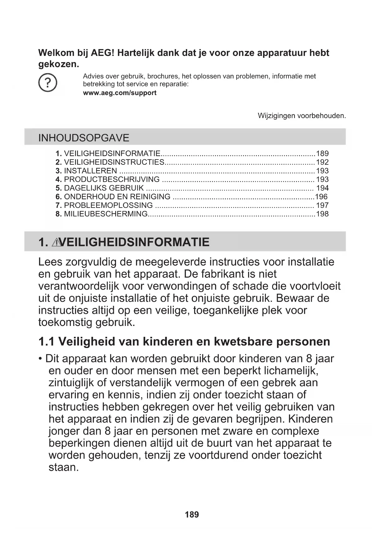 - Dit apparaat kan worden gebruikt door kinderen van 8 jaar en ouder en door mensen met een beperkt lichamelijk, zintuiglijk of verstandelijk vermogen of een gebrek aan ervaring en kennis, indien zij onder toezicht staan of instructies hebben gekregen over het veilig gebruiken van het apparaat en indien zij de gevaren begrijpen. Kinderen jonger dan 8 jaar en personen met zware en complexe beperkingen dienen altijd uit de buurt van het apparaat te worden gehouden, tenzij ze voortdurend onder toezicht staan. 189• Houd toezicht op kinderen, om te voorkomen dat zij gaan spelen met het apparaat.