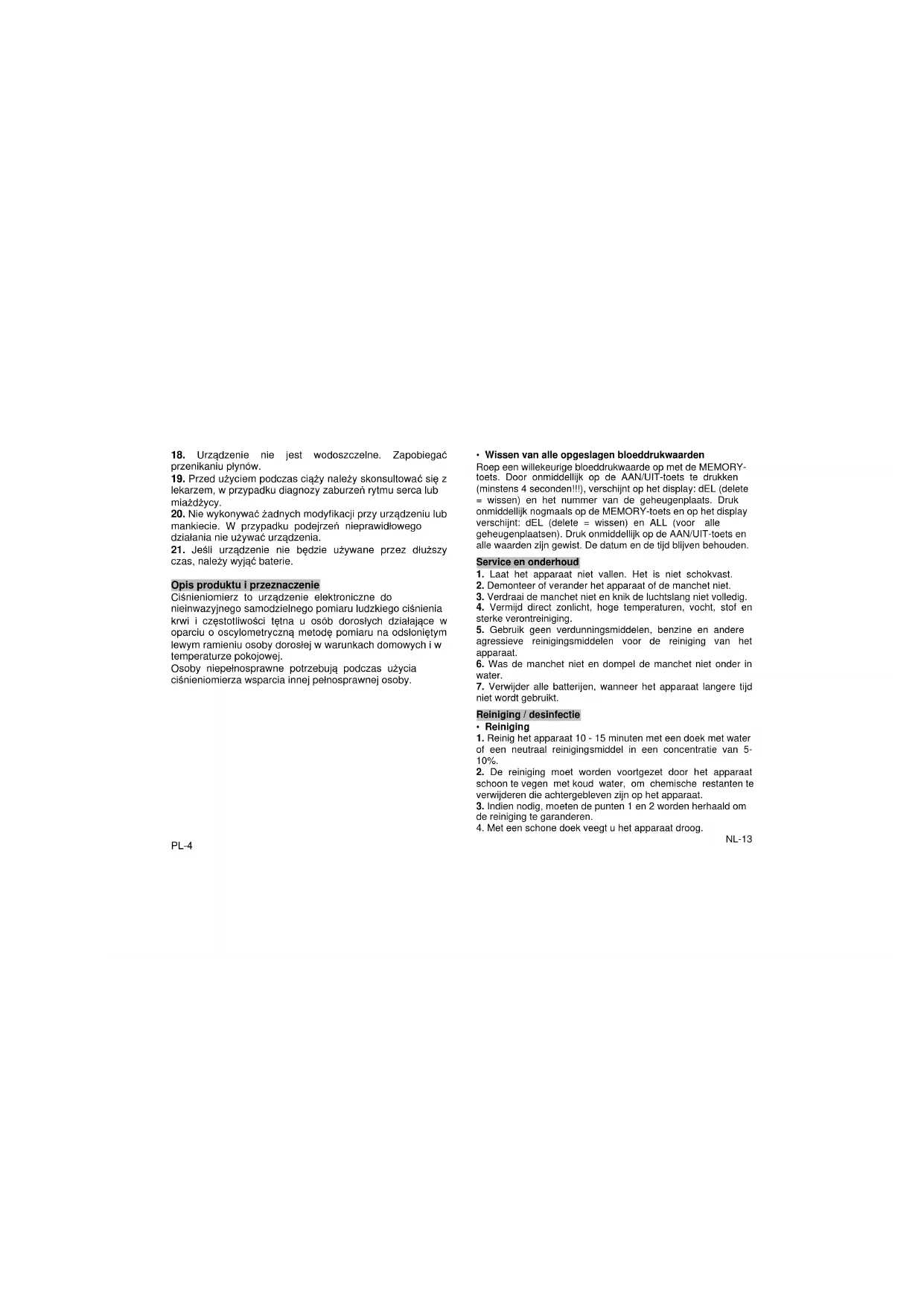 przeznaczeniem, gdy jest stosowane poza podanymi zakresami temperatury (10°C do 40°C) i wilgotności (15% PL-2 Technische gegevens Meetbereik: druk: 20 ~ 300 mmHg hartslagfrequentie: 40 ~ 200 slagen/min Nauwkeurigheid druk: 3 mmHg hartslagfrequentie: ± 5% van de meetwaarde Meetmethode: oscillometrische meetmethode Automatische uitschakeling: 150 seconden na de laatste toetsenbediening Geheugen: 2x50 sets Gewicht: ca. 328 g (inclusief batterijen) Manchetformaat: 22 - 32 cm Gebruiksomstandigheden: 5 ~ 40˚C, 15 ~ 90%RH Opslagcondities: -20 ~ 50 °C, <93% RH Spanningvoorziening: 6V (4 x LR03) Levensduur van de batterijen: ca. 250 metingen Wijzigingen met het oog op technische verbeteringen voorbehouden. Garantie-informatie Voor de bloeddrukmeter verlenen wij een garantie van 2 jaar. De kassabon geldt als garantiebewijs. Tijdens de garantieperiode wordt het defecte apparaat gratis gerepareerd. De garantie geldt niet voor beschadigingen die het gevolg zijn van onoordeelkundige behandeling, ongevallen, niet- inachtneming van de gebruiksaanwijzing of wijzigingen aan het apparaat door derden.