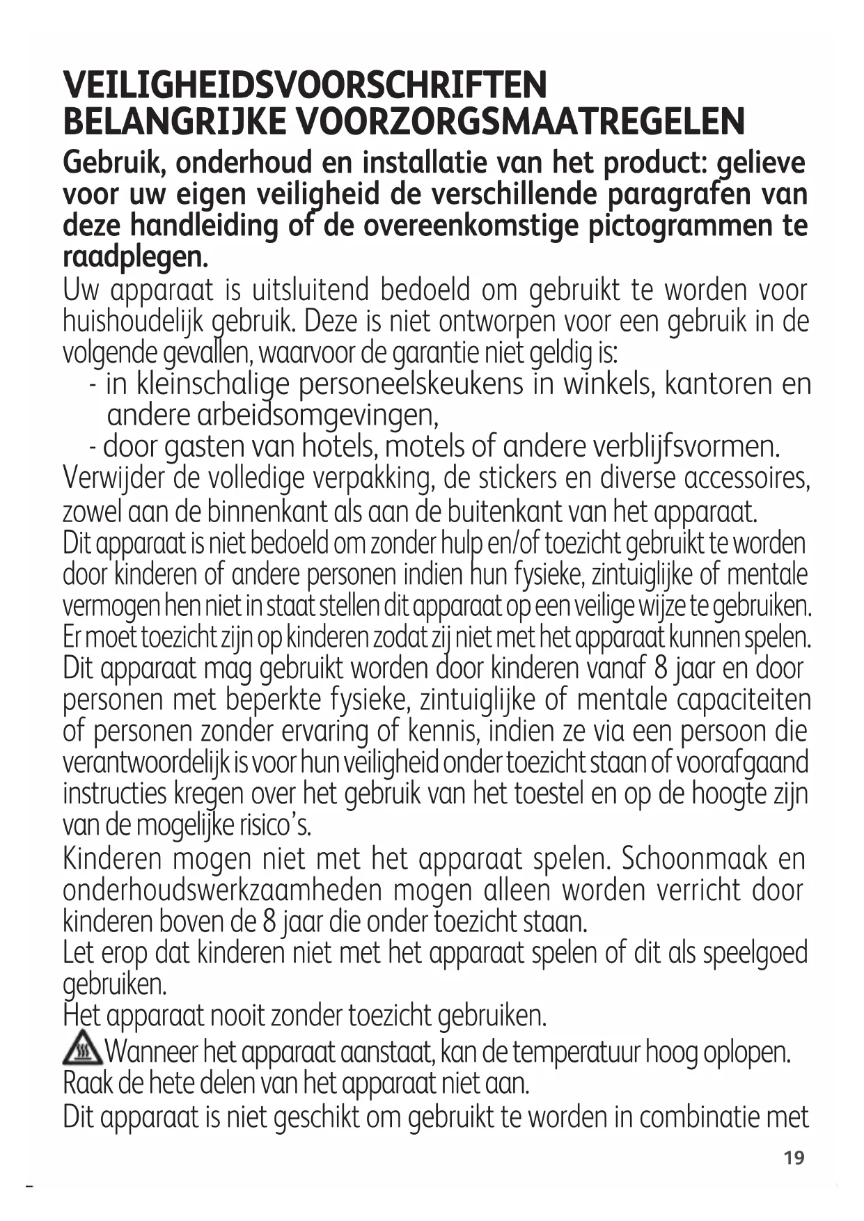 - BAKGIDS (WAARONDER HANDMATIGE MODUS) p.3319 VEILIGHEIDSVOORSCHRIFTEN BELANGRIJKE VOORZORGSMAATREGELEN Gebruik, onderhoud en installatie van het product: gelieve voor uw eigen veiligheid de verschillende paragrafen van deze handleiding of de overeenkomstige pictogrammen te raadplegen. Uw apparaat is uitsluitend bedoeld om gebruikt te worden voor huishoudelijk gebruik. Deze is niet ontworpen voor een gebruik in de volgende gevallen, waarvoor de garantie niet geldig is: - in kleinschalige personeelskeukens in winkels, kantoren en andere arbeidsomgevingen, - door gasten van hotels, motels of andere verblijfsvormen. Verwijder de volledige verpakking, de stickers en diverse accessoires, zowel aan de binnenkant als aan de buitenkant van het apparaat. Dit apparaat is niet bedoeld om zonder hulp en/of toezicht gebruikt te worden door kinderen of andere personen indien hun fysieke, zintuiglijke of mentale vermogen hen niet in staat stellen dit apparaat op een veilige wijze te gebruiken. Er moet toezicht zijn op kinderen zodat zij niet met het apparaat kunnen spelen. Dit apparaat mag gebruikt worden door kinderen vanaf 8 jaar en door personen met beperkte fysieke, zintuiglijke of mentale capaciteiten of personen zonder ervaring of kennis, indien ze via een persoon die verantwoordelijk is voor hun veiligheid onder toezicht staan of voorafgaand instructies kregen over het gebruik van het toestel en op de hoogte zijn van de mogelijke risico’s. Kinderen mogen niet met het apparaat spelen. Schoonmaak en onderhoudswerkzaamheden mogen alleen worden verricht door kinderen boven de 8 jaar die onder toezicht staan. Let erop dat kinderen niet met het apparaat spelen of dit als speelgoed gebruiken. Het apparaat nooit zonder toezicht gebruiken. Wanneer het apparaat aanstaat, kan de temperatuur hoog oplopen. Raak de hete delen van het apparaat niet aan. Dit apparaat is niet geschikt om gebruikt te worden in combinatie met20 een tijdschakelaar of afstandsbediening. Rol het snoer volledig uit. Wanneer het netsnoer is beschadigd dient deze te worden vervangen door de fabrikant, zijn servicedienst of een gelijkwaardig gekwalificeerd persoon om een gevaarlijke situatie te voorkomen. Als er een elektrisch verlengsnoer gebruikt wordt, moet deze minimaal van een gelijke doorsnede zijn en met een geïntegreerde geaarde stekker; neem de nodige voorzorgsmaatregelen om te voorkomen dat men hier over struikelt. Sluit het apparaat uitsluitend aan op een geaard stopcontact. Controleer of de elektrische installatie geschikt is voor de op het apparaat aangegeven stroomsterkte en spanning. Nooit het apparaat en het snoer in water onderdompelen. Dit apparaat mag worden gebruikt door kinderen vanaf 8 jaar en door personen met beperkte lichamelijke, zintuiglijke of geestelijke vermogens of zonder ervaring en kennis, op voorwaarde dat dit onder toezicht gebeurt of zij instructies hebben gekregen inzake het veilige gebruik van het apparaat en dat zij op de hoogte zijn van de risico's waaraan zij zijn blootgesteld. De reiniging en het onderhoud mag niet worden uitgevoerd door kinderen, tenzij ze minstens 8 jaar oud zijn en bovendien worden begeleid. Houd het apparaat en het netsnoer buiten het bereik van kinderen jonger dan 8 jaar. OPGELET: De grill niet laten opwarmen of voorverwarmen zonder de twee binnenste platen. Doen
