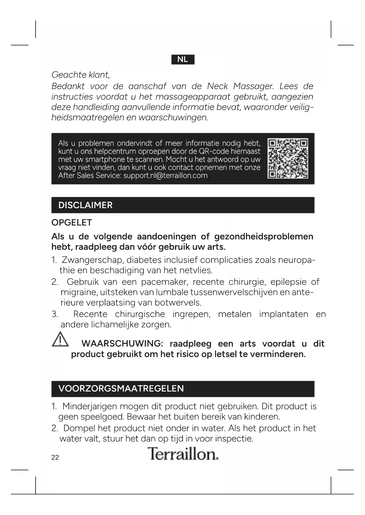 heidsmaatregelen en waarschuwingen. DISCLAIMER VOORZORGSMAATREGELEN OPGELET Als u de volgende aandoeningen of gezondheidsproblemen hebt, raadpleeg dan vóór gebruik uw arts. 1 Zwangerschap, diabetes inclusief complicaties zoals neuropa- thie en beschadiging van het netvlies 2 Gebruik van een pacemaker, recente chirurgie, epilepsie of migraine, uitsteken van lumbale tussenwervelschijven en ante- rieure verplaatsing van botwervels 3 Recente chirurgische ingrepen, metalen implantaten en andere lichamelijke zorgen WAARSCHUWING: raadpleeg een arts voordat u dit product gebruikt om het risico op letsel te verminderen. 1 Minderjarigen mogen dit product niet gebruiken Dit product is geen speelgoed Bewaar het buiten bereik van kinderen 2 Dompel het product niet onder in water Als het product in het water valt, stuur het dan op tijd in voor inspectie Als u problemen ondervindt of meer informatie nodig hebt, kunt u ons helpcentrum oproepen door de QR-code hiernaast met uw smartphone te scannen Mocht u het antwoord op uw vraag niet vinden, dan kunt u ook contact opnemen met onze After Sales Service: supportnl@terrailloncom23