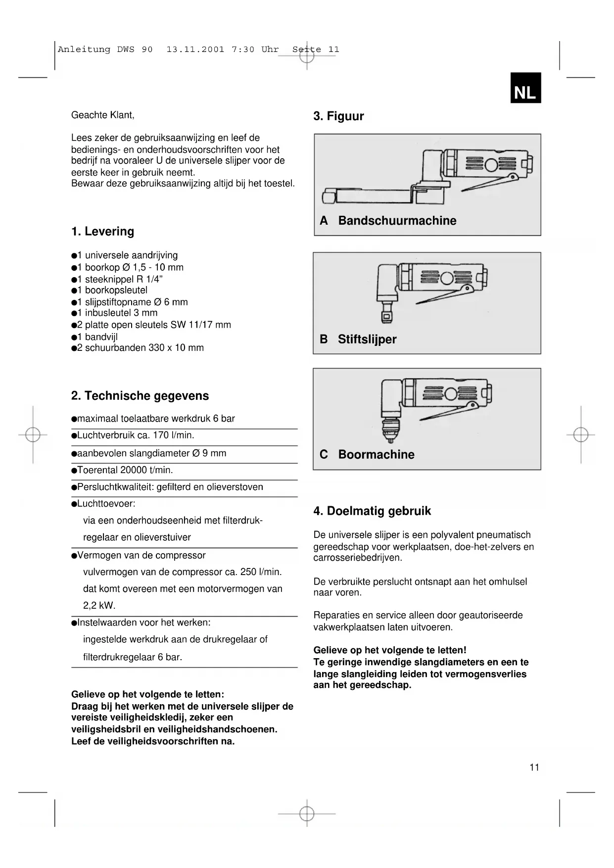 Meuleuse à barre Perceuse Anleitung DWS 90 13.11.2001 7:30 Uhr Seite 10Geachte Klant, Lees zeker de gebruiksaanwijzing en leef de bedienings- en onderhoudsvoorschriften voor het bedrijf na vooraleer U de universele slijper voor de eerste keer in gebruik neemt. Bewaar deze gebruiksaanwijzing altijd bij het toestel.