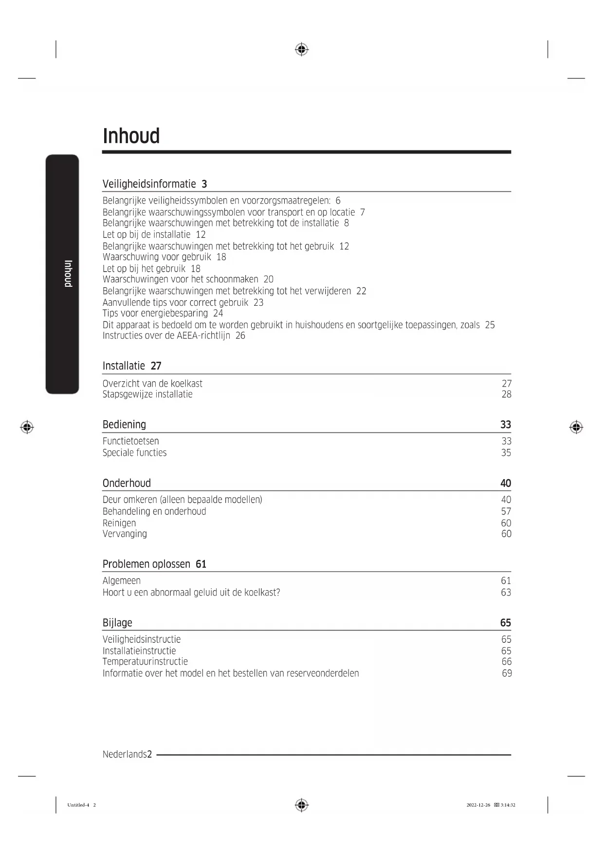 - Zorg dat kinderen niet in de koelkast kunnen komen. Ze kunnen worden opgesloten. Untitled-4 13 2022-12-26 3:14:33Veiligheidsinformatie Nederlands14 Veiligheidsinformatie