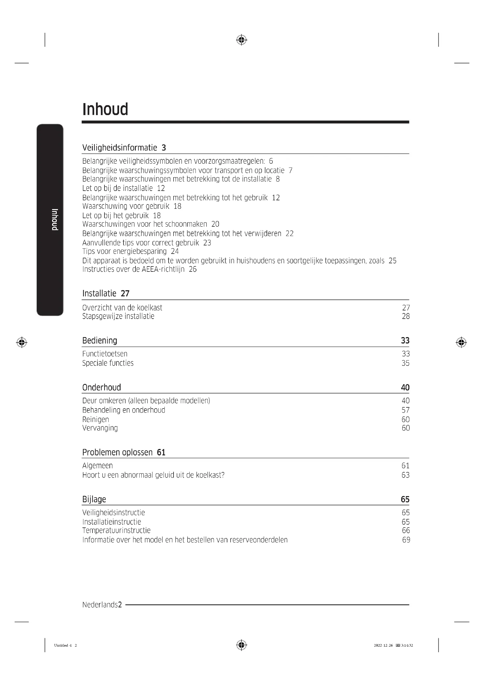 - Zorg dat kinderen niet in de koelkast kunnen komen. Ze kunnen worden opgesloten. Untitled-4 13 2022-12-26 3:14:33Veiligheidsinformatie Nederlands14 Veiligheidsinformatie
