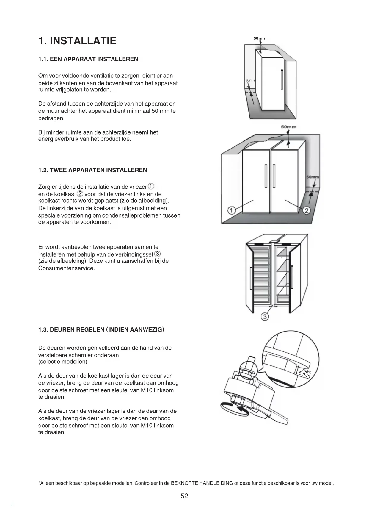 (ziedeafbeelding).Dezekuntuaanschaffenbijde Consumentenservice. 1.3. DEUREN REGELEN (INDIEN AANWEZIG) De deuren worden genivelleerd aan de hand van de verstelbare scharnier onderaan (selectiemodellen) Als de deur van de koelkast lager is dan de deur van devriezer,brengdedeurvandekoelkastdanomhoog doordestelschroefmeteensleutelvanM10linksom tedraaien. Als de deur van de vriezer lager is dan de deur van de koelkast,brengdedeurvandevriezerdanomhoog doordestelschroefmeteensleutelvanM10linksom tedraaien. *Alleenbeschikbaaropbepaaldemodellen.ControleerindeBEKNOPTEHANDLEIDINGofdezefunctiebeschikbaarisvooruwmodel. 50mm 50mm 5 mm max53