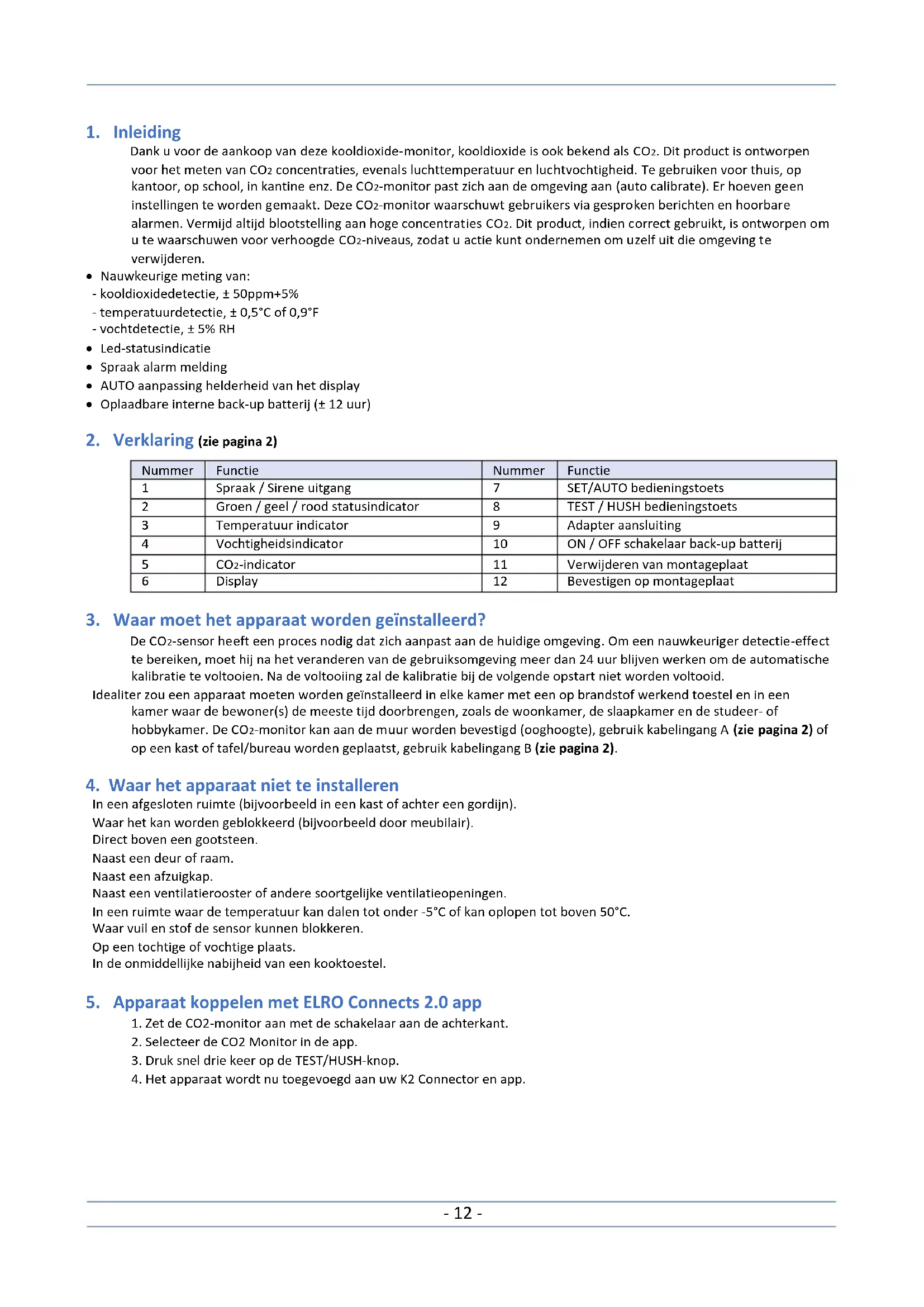 Deze CO2-monitor is ontworpen om u te waarschuwen voor een mogelijk gevaarlijke ophoping van kooldioxidegas. Hij is niet ontworpen om een kooldioxideprobleem te verhelpen of om een specifieke kooldioxidebron te lokaliseren. ELRO kan niet aansprakelijk worden gesteld voor een kooldioxide-onderzoek of service-oproep die naar aanleiding van een alarm wordt uitgevoerd of geregeld. ACCESSOIRE - SF50GA SMART HOME ALARM K2 CONNECTOR Uw link naar de ELRO Connects app. De K2 Connector maakt gebruik van Radio Frequentie (RF) technologie, die de kenmerken heeft van een laag stroomverbruik, hoge veiligheid en geavanceerde communicatie tussen RF-apparaten en maakt het mogelijk om een slim systeem te vormen met onze andere RF-producten, zoals: Rookmelders, Koolmonoxide alarmen, CO2 monitoren, Warmte- en wateralarmen, Deur-raamsensoren, Bewegingssensoren, Stopcontacten etc. etc.