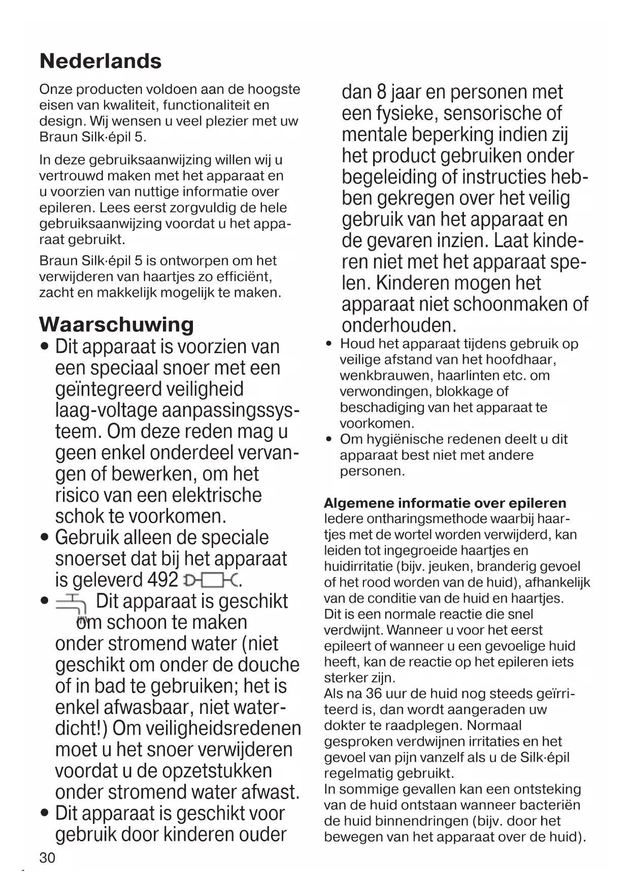 - Wanneer u eenmaal gewend bent aan het gevoel van epileren, kunt u het massageopzetstuk vervangen door het huidcontactopzetstuk (1b) dat nog meer contact maakt met de huid en zich beter aanpast aan alle regionen van het lichaam. 3 Benen epileren Hou het onderbeen omhoog tijdens het epileren. Voor het epileren van de knieholte houdt u het been gestrekt. 4 Oksel en bikinilijn epileren Let op: vooral in het begin kunnen deze lichaamsdelen zeer gevoelig zijn voor pijn. Daarom raden wij aan snelheid «I» te gebruiken wanneer u begint met epileren. Bij herhaaldelijk gebruik zal het pijnlijke gevoel afnemen. Voordat u gaat epileren moet u het te behandelen lichaamsdeel goed te wassen om bijv. restjes deodorant te verwijderen. Dep de oksel voorzichtig droog met een handdoek. Bij het epileren van de oksel houdt u uw arm omhoog zodat de huid gespannen staat en beweegt u het apparaat in verschillende richtingen. Omdat de huid direct na het epileren wat gevoelig kan zijn, kunt u beter geen irriterende huidverzorgingsproducten zoals deo- dorants met alcohol, gebruiken. 5 Het epileerhoofd reinigen Trek na het epileren het apparaat uit het (1) stopcontact en reinig het gebruikte epileerhoofd: a Reinigen met het borsteltje Verwijder eerst een van de opzetstukken en maak deze schoon met het borsteltje. Om de pincetjes schoon te maken, gebruik het borsteltje met een beetje alcohol. Draai de epileerschijf handmatig rond en reinig zo alle pincetten. Plaats na het schoonmaken het gewenste opzetstuk weer op het epileerhoofd. b Reinigen onder stromend water: Verwijder het opzetstuk. Houd het apparaat met het epileerhoofd onder stromend water. Druk vervolgens op de knop (5) om het epileerhoofd (2) te verwijderen. Beiden grondig schudden, zowel het epileerhoofd als het apparaat, om ervoor te zorgen dat het resterende water kan uitdruppelen. Laat beide delen drogen. Zorg ervoor dat ze helemaal droog zijn voor u het epileerhoofd weer bevestigd. B Zo gebruikt u het scheerhoofd Het scheerhoofd (7) is speciaal ontwikkeld om snel en glad scheren van benen, oksels en bikinilijn, trimmen van contouren en haar korter scheren tot een lengte van 5mm. Wanneer het scheerhoofd op het apparaat geklikt zit, mag het alleen gebruikt worden op een droge huid en met snelheidsinstelling «II». a Scheren: selecteer « ». b Contouren trimmen: selecteer « ». c Korter scheren van het haar op 5 mm lengte: selecteer « ». d Reinigen: Reinig het scheerblad (II) niet met het borsteltje omdat dit de folie zou kunnen beschadigen. e De scheeronderdelen moeten regelmatig, om de 3 maanden, te worden geolied. f Vervang het scheerblad (II) en de scheerblok (III) wanneer u merkt dat de scheerprestaties afnemen. Vervangonderdelen zijn bij uw verkooppunt verkrijgbaar of bij de 90340813_SE5_Power_MN.indd 3290340813_SE5_Power_MN.indd 32 02.06.22 10:4902.06.22 10:4933 Braun Customer Service Centra of via www.service.braun.com. Scheer nooit met een beschadigd scheerblad. Mededeling ter bescherming van het milieu Dit product bevat oplaadbare batterijen. Ter bescherming van het milieu mag dit product aan het einde van zijn nuttige levensduur niet met het gewone huisvuil worden weggegooid. Verwijdering kan plaatsvinden bij een Braun Service Center of bij de bekende verzamelplaatsen. Wijzigingen voorbehouden. Garantie Op dit product verlenen wij een garantie van 2 jaar geldend vanaf datum van aankoop. Binnen de garantieperiode zullen eventuele fabricagefouten en/of materiaalfouten gratis door ons worden verholpen, hetzij door reparatie, vervanging van onderdelen of omruilen van het apparaat. Deze garantie is van toepassing in elk land waar dit apparaat wordt geleverd door Braun of een officieel aangestelde vertegenwoordiger van Braun. Beschadigingen ten gevolge van onoordeelkundig gebruik, normale slijtage en gebreken die de werking of waarde van het apparaat niet noemenswaardig beïnvloeden vallen niet onder de garantie. De garantie vervalt bij reparatie door niet door ons erkende service-afdelingen en/of gebruik van niet originele Braun onderdelen. Om gebruik te maken van onze service binnen de garantieperiode, dient u het complete apparaat met uw aankoopbewijs af te geven of op te sturen naar een geautoriseerd Braun Customer Service Center: www.service.braun.com. Bel 0 800 445 53 88 (NL) of 0800 14592 (BE) voor een Braun Customer Service Center bij u in de buurt. 90340813_SE5_Power_MN.indd 3390340813_SE5_Power_MN.indd 33 02.06.22 10:4902.06.22 10:4934 Vores produkter er skabt til at opfylde de største krav med hensyn til kvalitet, funktionalitet og design. Vi håber, du vil få stor glæde af at anvende din Braun Silk·épil 5. Læs hele brugervejledningen omhyg- geligt, før apparatet tages i brug, og behold den til senere brug. Braun Silk·épil 5 er skabt til at gøre fjernelse af uønsket hårvækst så effektiv, nænsom og let som muligt. Advarsel