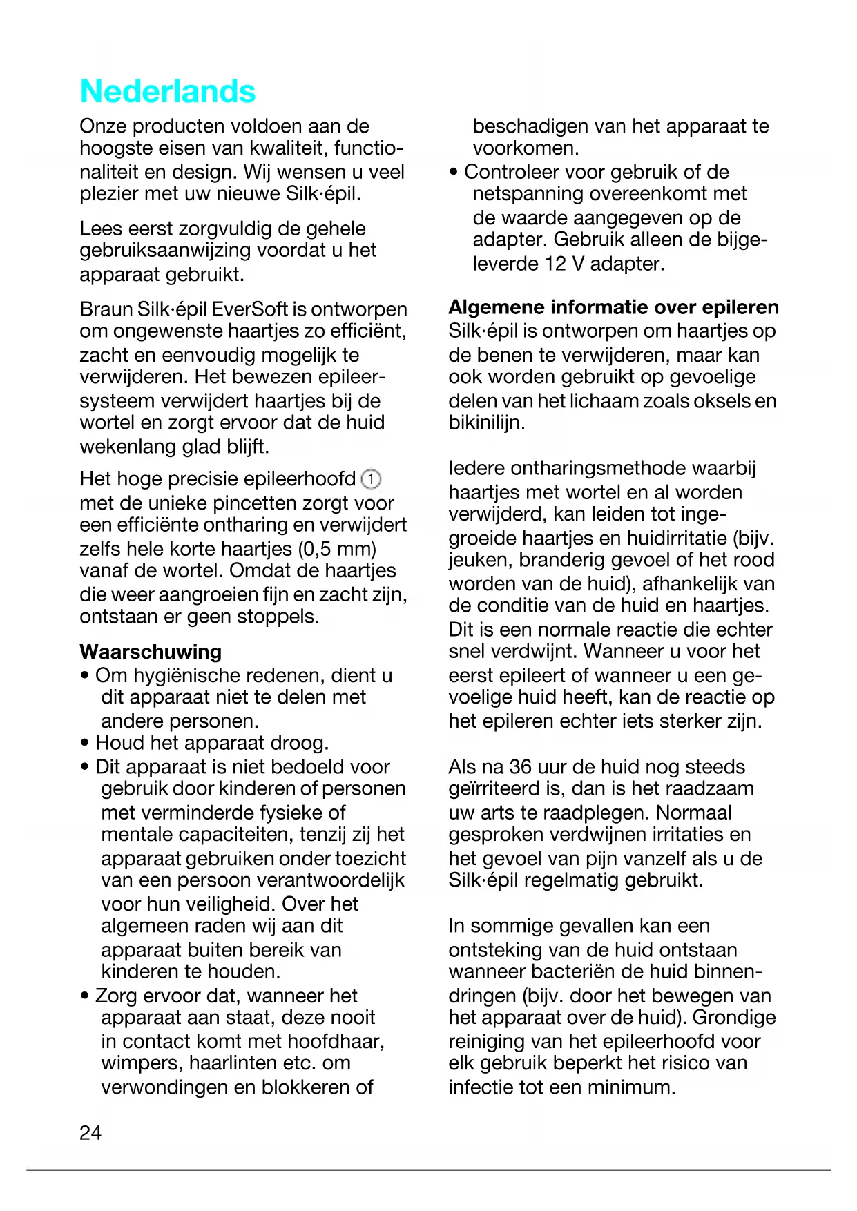 5366377_SE2180_P6-52 Seite 23 Donnerstag, 13. Dezember 2007 3:39 1524 Nederlands Onze producten voldoen aan de hoogste eisen van kwaliteit, functio- naliteit en design. Wij wensen u veel plezier met uw nieuwe Silk·épil. Lees eerst zorgvuldig de gehele gebruiksaanwijzing voordat u het apparaat gebruikt. Braun Silk·épil EverSoft is ontworpen om ongewenste haartjes zo efficiënt, zacht en eenvoudig mogelijk te verwijderen. Het bewezen epileer- systeem verwijdert haartjes bij de wortel en zorgt ervoor dat de huid wekenlang glad blijft. Het hoge precisie epileerhoofd met de unieke pincetten zorgt voor een efficiënte ontharing en verwijdert zelfs hele korte haartjes (0,5 mm) vanaf de wortel. Omdat de haartjes die weer aangroeien fijn en zacht zijn, ontstaan er geen stoppels. Waarschuwing