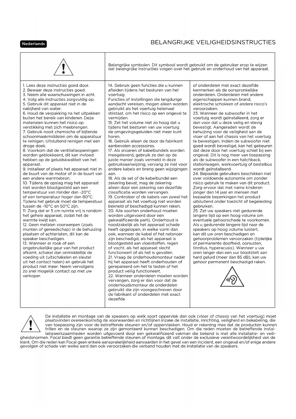 T3Y Handleiding Dashboard Zorg er bij het plaatsen van de schroeven voor dat ze in de openingen worden geschroefd en niet ernaast vallen. Dit is niet heel erg, maar het kan lastig zijn om de schroeven weer terug te vinden. Indien u nieuwe schroeven nodig hebt, kies dan voor zelftappende schroeven met een diameter van 5 mm en lengte van 15 mm (M5x15). Gedeelte onder het dashboard Zorg ervoor dat u de bedrading die u niet nodig hebt ook niet aanraakt. Het filter wordt alleen in het gedeelte onder het dashboard geplaatst. Zorg er tijdens het terugplaatsen van het gedeelte onder het dashboard voor dat u alle onderdelen correct terug plaatst, zodat de naden goed worden bedekt. Onderhoud Reinig de IW T3Y 200, ICC T3Y 100, IS T3Y 100 en IC T3Y 100 uitsluitend met een droge doek. Wanneer het rooster vuil is, kunt u een licht vochtige doek gebruiken. Gebruik nooit oplosmiddelen, schoonmaakmiddelen, alcohol, bijtende stoffen, schuursponsjes of andere schurende materialen om de speakers schoon te maken. Aanpassingsperiode De speakers IW T3Y 200, ICC T3Y 100, IS T3Y 100 en IC T3Y 100 bestaan uit complexe mechanische onderdelen die een aanpassingsperiode vereisen om optimaal te werken. Deze aanpassingsperiode verschilt naargelang de omstandigheden en kan verschillende weken duren. Om deze periode te versnellen kunt u de speakers minstens twintig opeenvolgende uren laten werken op een gemiddeld geluidsniveau. Zodra de eigenschappen van uw speakers volledig stabiel zijn, kunt u volledig gebruikmaken van het volledige vermogen van uw producten. Garantievoorwaarden Alle Focal-luidsprekers zijn gedekt door een garantie die is bepaald door de officiële Focal-distributeur in uw land. Uw distributeur kan alle details over de garantievoorwaarden verstrekken. De garantie dekt ten minste de juridisch bepaalde garanties die van kracht zijn in het land waar de oorspronkelijke aankoopfactuur is afgegeven.ВАЖНЫЕ ИНСТРУКЦИИ ПО ТЕХНИКЕ БЕЗОПАСНОСТИ! Polskie Metody instalacji i mocowania kolumn na dowolnych powierzchniach (podłoga lub podwozie samochodu) powinny być zgodne z warunkami i normami dotyczącymi instalacji, rozmieszczenia, bezpieczeństwa i okablowania obowiązującymi dla danej powierzchni i podłoża. Ponadto produkty mogą wytwarzać drgania i uszkodzić podłoże, do którego są przy- mocowane. Z tego powodu operacja instalacji musi być wykonywana przez wykwalifikowanego specjalistę, zaznajomio- nego ze standardami instalacji i bezpieczeństwa. Firma Focal nie udziela żadnej gwarancji co do podłoża lub instalacji, a za realizację instalacji kolumn odpowiada wyłącznie klient. Dlatego firma Focal w żaden sposób nie ponosi odpowiedzialności za wszelkie incydenty, wypadki i/lub jakichkolwiek inne konsekwencje lub uszkodzenia związane z instalacją kolumn. Symbole ostrzeżeń. Ten symbol informuje użytkownika o obecności ważnych zale- ceń, które dotyczą obsługi, użytkowania i konserwacji urządzenia.