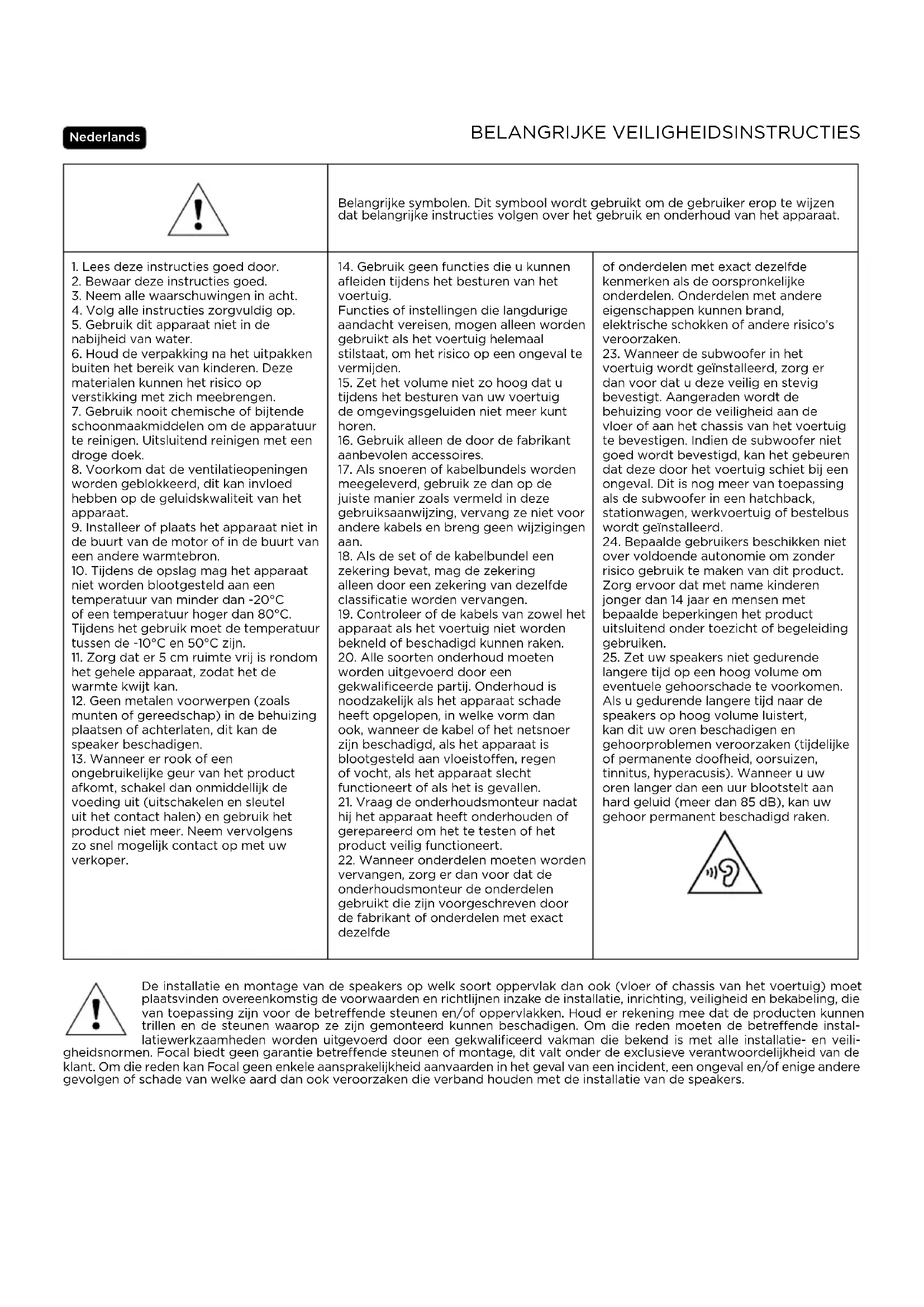T3Y Handleiding Dashboard Zorg er bij het plaatsen van de schroeven voor dat ze in de openingen worden geschroefd en niet ernaast vallen. Dit is niet heel erg, maar het kan lastig zijn om de schroeven weer terug te vinden. Indien u nieuwe schroeven nodig hebt, kies dan voor zelftappende schroeven met een diameter van 5 mm en lengte van 15 mm (M5x15). Gedeelte onder het dashboard Zorg ervoor dat u de bedrading die u niet nodig hebt ook niet aanraakt. Het filter wordt alleen in het gedeelte onder het dashboard geplaatst. Zorg er tijdens het terugplaatsen van het gedeelte onder het dashboard voor dat u alle onderdelen correct terug plaatst, zodat de naden goed worden bedekt. Onderhoud Reinig de IW T3Y 200, ICC T3Y 100, IS T3Y 100 en IC T3Y 100 uitsluitend met een droge doek. Wanneer het rooster vuil is, kunt u een licht vochtige doek gebruiken. Gebruik nooit oplosmiddelen, schoonmaakmiddelen, alcohol, bijtende stoffen, schuursponsjes of andere schurende materialen om de speakers schoon te maken. Aanpassingsperiode De speakers IW T3Y 200, ICC T3Y 100, IS T3Y 100 en IC T3Y 100 bestaan uit complexe mechanische onderdelen die een aanpassingsperiode vereisen om optimaal te werken. Deze aanpassingsperiode verschilt naargelang de omstandigheden en kan verschillende weken duren. Om deze periode te versnellen kunt u de speakers minstens twintig opeenvolgende uren laten werken op een gemiddeld geluidsniveau. Zodra de eigenschappen van uw speakers volledig stabiel zijn, kunt u volledig gebruikmaken van het volledige vermogen van uw producten. Garantievoorwaarden Alle Focal-luidsprekers zijn gedekt door een garantie die is bepaald door de officiële Focal-distributeur in uw land. Uw distributeur kan alle details over de garantievoorwaarden verstrekken. De garantie dekt ten minste de juridisch bepaalde garanties die van kracht zijn in het land waar de oorspronkelijke aankoopfactuur is afgegeven.ВАЖНЫЕ ИНСТРУКЦИИ ПО ТЕХНИКЕ БЕЗОПАСНОСТИ! Polskie Metody instalacji i mocowania kolumn na dowolnych powierzchniach (podłoga lub podwozie samochodu) powinny być zgodne z warunkami i normami dotyczącymi instalacji, rozmieszczenia, bezpieczeństwa i okablowania obowiązującymi dla danej powierzchni i podłoża. Ponadto produkty mogą wytwarzać drgania i uszkodzić podłoże, do którego są przy- mocowane. Z tego powodu operacja instalacji musi być wykonywana przez wykwalifikowanego specjalistę, zaznajomio- nego ze standardami instalacji i bezpieczeństwa. Firma Focal nie udziela żadnej gwarancji co do podłoża lub instalacji, a za realizację instalacji kolumn odpowiada wyłącznie klient. Dlatego firma Focal w żaden sposób nie ponosi odpowiedzialności za wszelkie incydenty, wypadki i/lub jakichkolwiek inne konsekwencje lub uszkodzenia związane z instalacją kolumn. Symbole ostrzeżeń. Ten symbol informuje użytkownika o obecności ważnych zale- ceń, które dotyczą obsługi, użytkowania i konserwacji urządzenia.