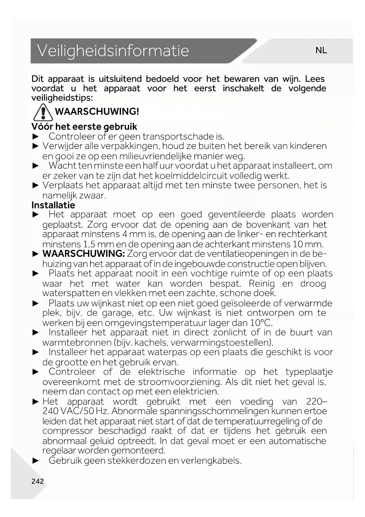 242 Veiligheidsinformatie Dit apparaat is uitsluitend bedoeld voor het bewaren van wijn. Lees voordat u het apparaat voor het eerst inschakelt de volgende veiligheidstips: WAARSCHUWING!