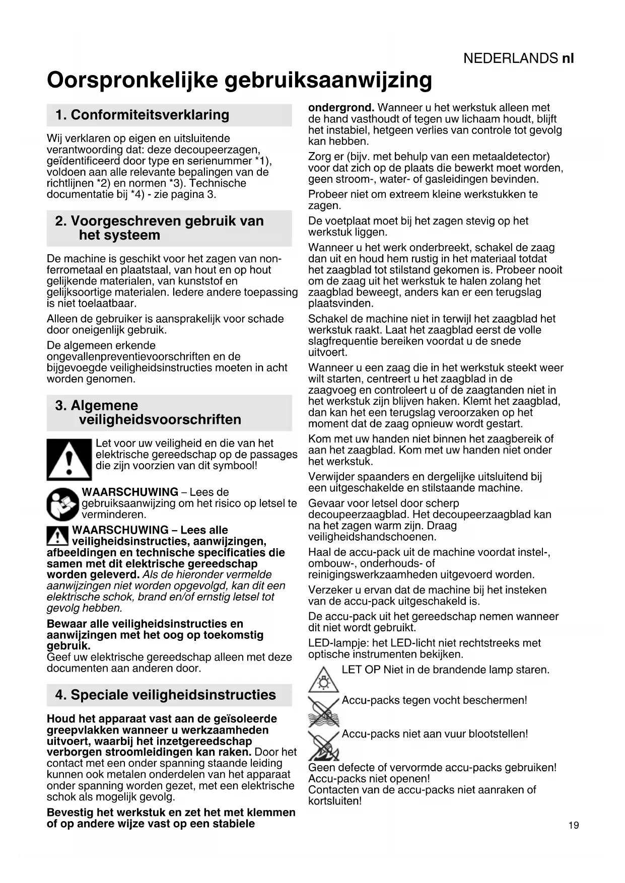 Oorspronkelijke gebruiksaanwijzing Wij verklaren op eigen en uitsluitende verantwoording dat: deze decoupeerzagen, geïdentificeerd door type en serienummer *1), voldoen aan alle relevante bepalingen van de richtlijnen *2) en normen *3). Technische documentatie bij *4) - zie pagina 3. De machine is geschikt voor het zagen van non- ferrometaal en plaatstaal, van hout en op hout gelijkende materialen, van kunststof en gelijksoortige materialen. Iedere andere toepassing is niet toelaatbaar. Alleen de gebruiker is aansprakelijk voor schade door oneigenlijk gebruik. De algemeen erkende ongevallenpreventievoorschriften en de bijgevoegde veiligheidsinstructies moeten in acht worden genomen. Let voor uw veiligheid en die van het elektrische gereedschap op de passages die zijn voorzien van dit symbool! WAARSCHUWING – Lees de gebruiksaanwijzing om het risico op letsel te verminderen. WAARSCHUWING – Lees alle veiligheidsinstructies, aanwijzingen, afbeeldingen en technische specificaties die samen met dit elektrische gereedschap worden geleverd. Als de hieronder vermelde aanwijzingen niet worden opgevolgd, kan dit een elektrische schok, brand en/of ernstig letsel tot gevolg hebben. Bewaar alle veiligheidsinstructies en aanwijzingen met het oog op toekomstig gebruik. Geef uw elektrische gereedschap alleen met deze documenten aan anderen door. Houd het apparaat vast aan de geïsoleerde greepvlakken wanneer u werkzaamheden uitvoert, waarbij het inzetgereedschap verborgen stroomleidingen kan raken. Door het contact met een onder spanning staande leiding kunnen ook metalen onderdelen van het apparaat onder spanning worden gezet, met een elektrische schok als mogelijk gevolg. Bevestig het werkstuk en zet het met klemmen of op andere wijze vast op een stabiele ondergrond. Wanneer u het werkstuk alleen met de hand vasthoudt of tegen uw lichaam houdt, blijft het instabiel, hetgeen verlies van controle tot gevolg kan hebben. Zorg er (bijv. met behulp van een metaaldetector) voor dat zich op de plaats die bewerkt moet worden, geen stroom-, water- of gasleidingen bevinden. Probeer niet om extreem kleine werkstukken te zagen. De voetplaat moet bij het zagen stevig op het werkstuk liggen. Wanneer u het werk onderbreekt, schakel de zaag dan uit en houd hem rustig in het materiaal totdat het zaagblad tot stilstand gekomen is. Probeer nooit om de zaag uit het werkstuk te halen zolang het zaagblad beweegt, anders kan er een terugslag plaatsvinden. Schakel de machine niet in terwijl het zaagblad het werkstuk raakt. Laat het zaagblad eerst de volle slagfrequentie bereiken voordat u de snede uitvoert. Wanneer u een zaag die in het werkstuk steekt weer wilt starten, centreert u het zaagblad in de zaagvoeg en controleert u of de zaagtanden niet in het werkstuk zijn blijven haken. Klemt het zaagblad, dan kan het een terugslag veroorzaken op het moment dat de zaag opnieuw wordt gestart. Kom met uw handen niet binnen het zaagbereik of aan het zaagblad. Kom met uw handen niet onder het werkstuk. Verwijder spaanders en dergelijke uitsluitend bij een uitgeschakelde en stilstaande machine. Gevaar voor letsel door scherp decoupeerzaagblad. Het decoupeerzaagblad kan na het zagen warm zijn. Draag veiligheidshandschoenen. Haal de accu-pack uit de machine voordat instel-, ombouw-, onderhouds- of reinigingswerkzaamheden uitgevoerd worden. Verzeker u ervan dat de machine bij het insteken van de accu-pack uitgeschakeld is. De accu-pack uit het gereedschap nemen wanneer dit niet wordt gebruikt. LED-lampje: het LED-licht niet rechtstreeks met optische instrumenten bekijken. LET OP Niet in de brandende lamp staren. Accu-packs tegen vocht beschermen! Accu-packs niet aan vuur blootstellen! Geen defecte of vervormde accu-packs gebruiken! Accu-packs niet openen! Contacten van de accu-packs niet aanraken of kortsluiten!