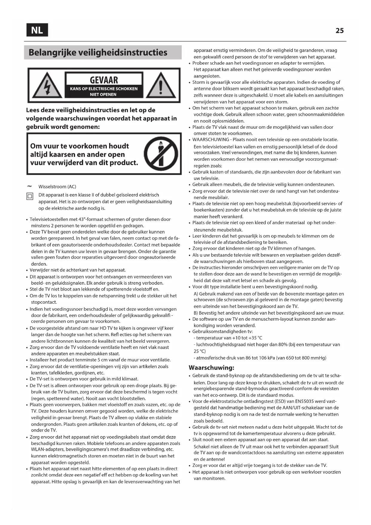 Lees deze veiligheidsinstructies en let op de volgende waarschuwingen voordat het apparaat in gebruik wordt genomen: Om vuur te voorkomen houdt altijd kaarsen en ander open vuur verwijderd van dit product. Wisselstroom (AC)Dit apparaat is een klasse II of dubbel geïsoleerd elektrisch apparaat. Het is zo ontworpen dat er geen veiligheidsaansluiting op de elektrische aarde nodig is.• Televisietoestellen met 43"-formaat schermen of groter dienen door minstens 2 personen te worden opgetild en gedragen.• Deze TV bevat geen onderdelen welke door de gebruiker kunnen worden gerepareerd. In het geval van falen, neem contact op met de fa-brikant of een geautoriseerde onderhoudsdealer. Contact met bepaalde delen in de TV kunnen uw leven in gevaar brengen. Onder de garantie vallen geen fouten door reparaties uitgevoerd door ongeautoriseerde derden.• Verwijder niet de achterkant van het apparaat.• Dit apparaat is ontworpen voor het ontvangen en vermeerderen van beeld- en geluidssignalen. Elk ander gebruik is streng verboden.• Stel de TV niet bloot aan lekkende of spetterende vloeistoff en.• Om de TV los te koppelen van de netspanning trekt u de stekker uit het stopcontact.• Indien het voedingssnoer beschadigd is, moet deze worden vervangen door de fabrikant, een onderhoudsdealer of gelijkwaardig gekwali -ceerde personen om gevaar te voorkomen.• De voorgestelde afstand om naar HD TV te kijken is ongeveer vijf keer langer dan de hoogte van het scherm. Re ecties op het scherm van andere lichtbronnen kunnen de kwaliteit van het beeld verergeren.• Zorg ervoor dan de TV voldoende ventilatie heeft en niet vlak naast andere apparaten en meubelstukken staat.• Installeer het product tenminste 5 cm vanaf de muur voor ventilatie.• Zorg ervoor dat de ventilatie-openingen vrij zijn van artikelen zoals kranten, tafelkleden, gordijnen, etc.• De TV-set is ontworpen voor gebruik in mild klimaat.• De TV-set is alleen ontworpen voor gebruik op een droge plaats. Bij ge-bruik van de TV buiten, zorg ervoor dat deze beschermd is tegen vocht (regen, spetterend water). Nooit aan vocht blootstellen.• Plaats geen voorwerpen, bakken met vloeistoff en zoals vazen, etc. op de TV. Deze houders kunnen omver gegooid worden, welke de elektrische veiligheid in gevaar brengt. Plaats de TV alleen op vlakke en stabiele ondergronden. Plaats geen artikelen zoals kranten of dekens, etc. op of onder de TV.• Zorg ervoor dat het apparaat niet op voedingskabels staat omdat deze beschadigd kunnen raken. Mobiele telefoons an andere apparaten zoals WLAN-adapters, beveiligingscamera’smet draadloze verbinding, etc. kunnen elektromagnetisch storen en moeten niet in de buurt van het apparaat worden opgesteld.• Plaats het apparaat niet naast hitte elementen of op een plaats in direct zonlicht omdat deze een negatief eff ect hebben op de koeling van het apparaat. Hitte opslag is gevaarlijk en kan de levensverwachting van het apparaat ernstig verminderen. Om de veiligheid te garanderen, vraag een gekwali ceerd persoon de stof te verwijderen van het apparaat.• Probeer schade aan het voedingssnoer en adapter te vermijden. Het apparaat kan alleen met het geleverde voedingssnoer worden aangesloten.• Storm is gevaarlijk voor alle elektrische apparaten. Indien de voeding of antenne door bliksem wordt geraakt kan het apparaat beschadigd raken, zelfs wanneer deze is uitgeschakeld. Umoet alle kabels en aansluitingen verwijderen van het apparaat voor een storm.• Om het scherm van het apparaat schoon te maken, gebruik een zachte vochtige doek. Gebruik alleen schoon water, geen schoonmaakmiddelen en nooit oplosmiddelen.• Plaats de TV vlak naast de muur om de mogelijkheid van vallen door omver stoten te voorkomen.• WAARSCHUWING - Plaats nooit een televisie op een onstabiele locatie. Een televisietoestel kan vallen en ernstig persoonlijk letsel of de dood veroorzaken. Veel verwondingen, met name die bij kinderen, kunnen worden voorkomen door het nemen van eenvoudige voorzorgsmaat-regelen zoals:• Gebruik kasten of standaards, die zijn aanbevolen door de fabrikant van uw televisie.• Gebruik alleen meubels, die de televisie veilig kunnen ondersteunen.• Zorg ervoor dat de televisie niet over de rand hangt van het ondersteu-nende meubilair.• Plaats de televisie niet op een hoog meubelstuk (bijvoorbeeld servies- of boekenkasten) zonder dat u het meubelstuk en de televisie op de juiste manier heeft verankerd.• Plaats de televisie niet op een kleed of ander materiaal op het onder-steunende meubelstuk.• Leer kinderen dat het gevaarlijk is om op meubels te klimmen om de televisie of de afstandsbediening te bereiken.• Zorg ervoor dat kinderen niet op de TV klimmen of hangen.• Als u uw bestaande televisie wilt bewaren en verplaatsen gelden dezelf-de waarschuwingen als hierboven staat aangegeven.• De instructies hieronder omschrijven een veiligere manier om de TV op te stellen door deze aan de wand te bevestigen en vermijd de mogelijk-heid dat deze valt met letsel en schade als gevolg.• Voor dit type installatie bent ueen bevestigingskoord nodig.A) Gebruik makend van een of beide van de bovenste montage gaten en schroeven (de schroeven zijn al geleverd in de montage gaten) bevestig een uiteinde van het bevestigingskoord aan de TV.B) Bevestig het andere uiteinde van het bevestigingskoord aan uw muur.• De software op uw TV en de menuscherm-layout kunnen zonder aan-kondiging worden veranderd.• Gebruiksomstandigheden tv:- temperatuur van +10 tot +35 °C- luchtvochtigheidsgraad niet hoger dan 80% (bij een temperatuur van 25 °C)- atmosferische druk van 86 tot 106 kPa (van 650 tot 800 mmHg) Waarschuwing: